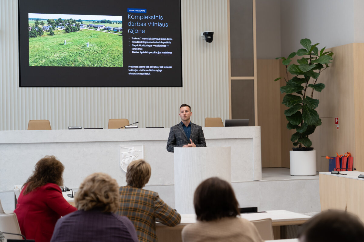 Kitas pristatymas buvo skirtas praktinei patirčiai – UAB „Naikinta“ kenkėjų kontrolės įmonės vadovas Domas Zastartas apžvelgė 2024 m. vykdytus šliužų naikinimo darbus Vilniaus rajono Bukiškio gyvenvietėje, kurie truko 7 mėnesius.
