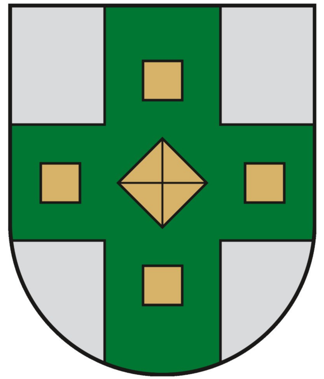 The coat of arms of the settlement marks the uniqueness of Didžioji Riešė as the geographical centre of Europe. The shield of the coat of arms depicts important symbols: the golden coloured figures symbolise the sculptures of the “Monument to the Centre of Europe” and the “Stamp” in the “Europos Parkas” museum, which in the overall composition underline the specific geographical location of Riešė. The green colour used in the heraldic cross symbolises the indescribable beauty of the area and its unique natural fauna. In heraldry, this colour also represents freedom, beauty, joy, health and hope.