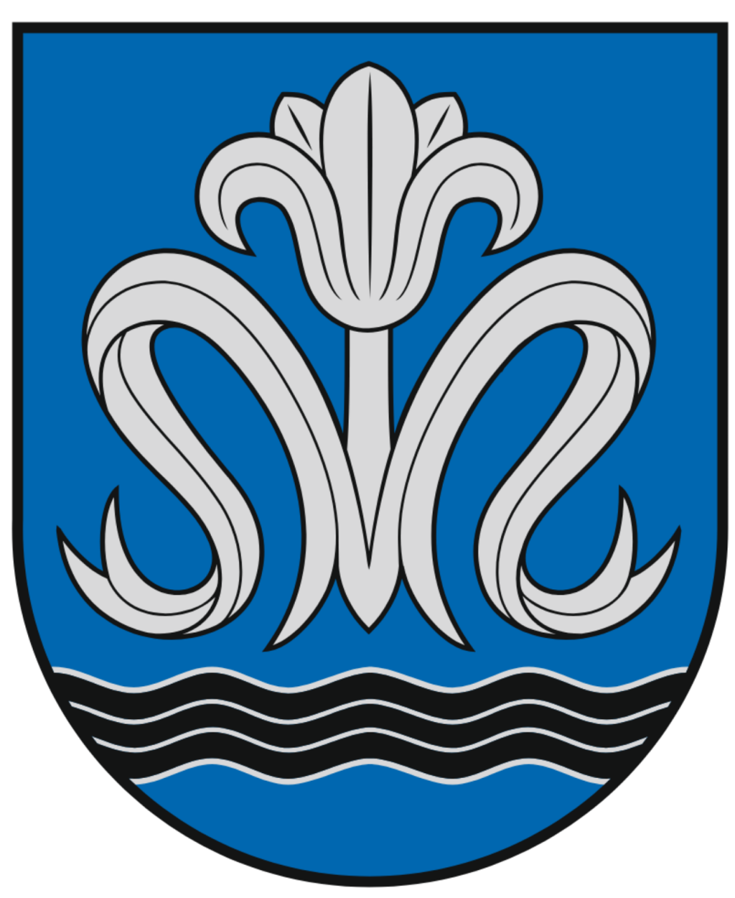 The symbols chosen for the coat of arms – the silver letter “M” symbolises not only the first letter of the name of the village of Marijampolis, but also echoes the name of the monogram of the Virgin Mary. The silver lily – the motif of a white lily – is part of the heraldic composition of the Marian monastic order. The lily is a symbol of chastity, purity and light in the Christian tradition, which is embodied by the white colour of the flowers. The lily is often used to represent Christ at the Last Judgement: the white lily blossoms unfurling in the front of the face of the Judge of the World symbolise grace, favour and mercy. The lily ornament is a favourite motif in folk art and folk songs of various nations. The lily ring also symbolises the homesteads cherished by the villagers of Marijampolis, where the people of this land have lived and worked since ancient times. The motif of a black, meandering stream refers to the river called Juodė, which flows through Marijampolis.