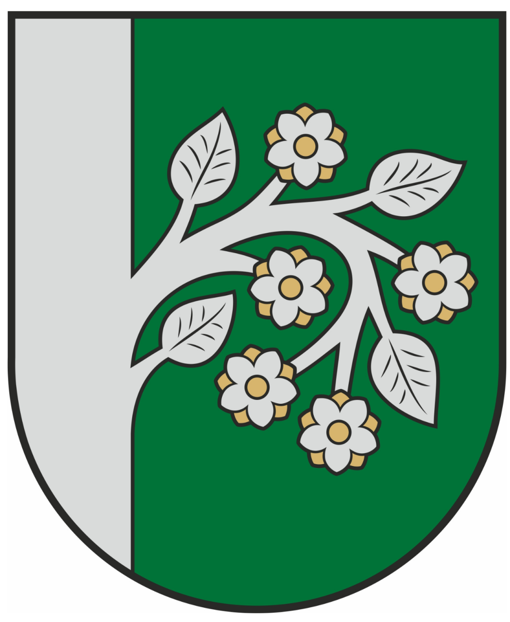 The symbol chosen for the coat of arms are the green shield of the coat of arms with a silver left side symbolising the Vokė river flowing through Pagiriai. On the right side of the shield is a silver branch of a flowering apple tree. The composition of the silver left side and the silver flowering branch of the apple tree rotating in an arch is reminiscent of the letter “P”, the first letter of the name of the village Pagiriai. The blossoming apple branch is symbolic of the growing and developing community of Pagiriai.