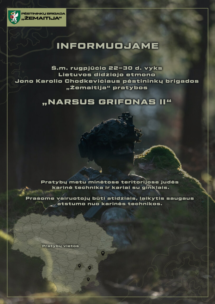 Informuojame, kad 2025 m. rugpjūčio 22–30 d. vyks Lietuvos kariuomenės Lietuvos didžiojo etmono Jono Karolio Chodkevičiaus pėstininkų brigados „Žemaitija“ (toliau – PBŽ) pratybos „Narsus Grifonas II“. Šių pratybų tikslas – patikrinti PBŽ gebėjimą vykdyti štabo ir padalinių perdislokavimą į numatytus rajonus.