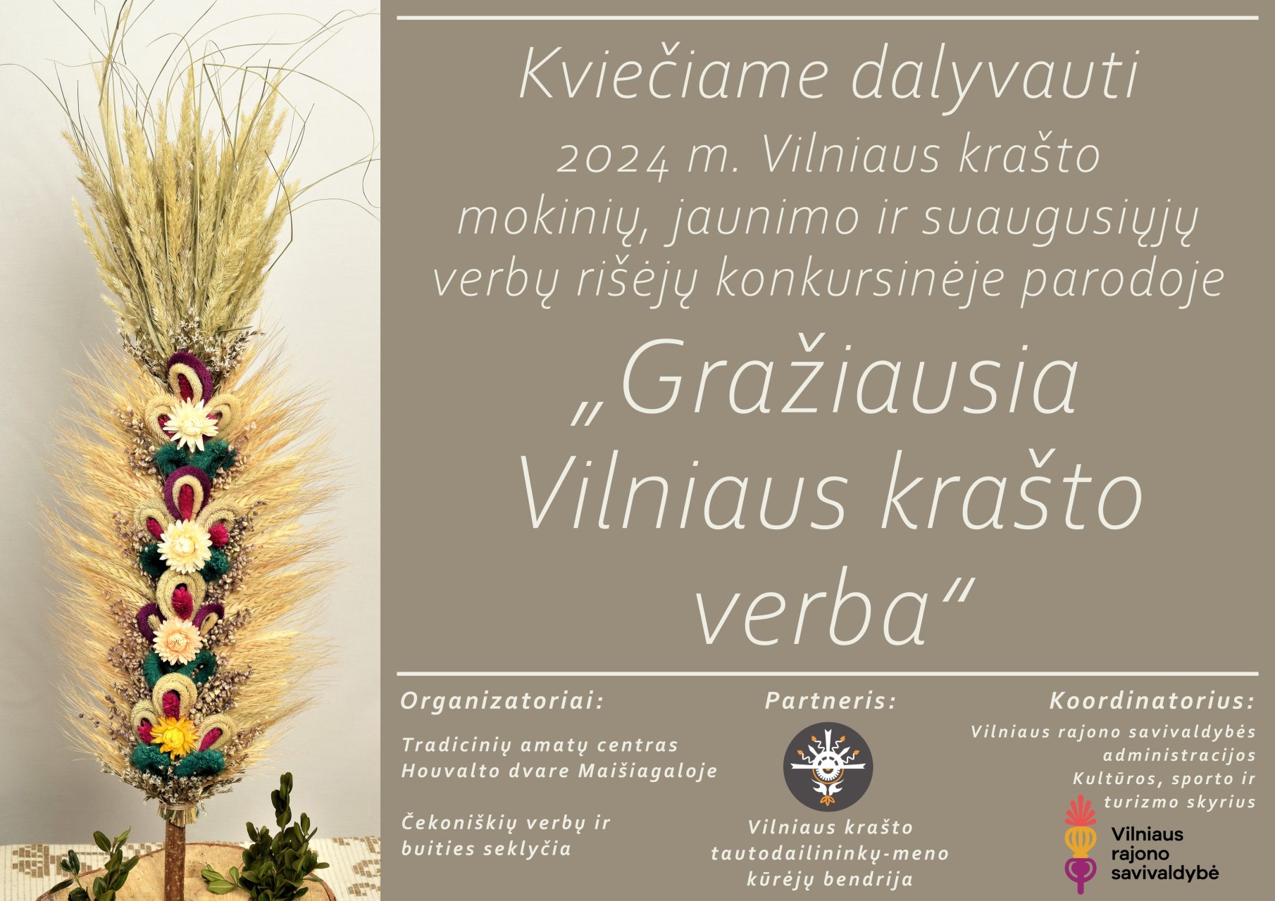 Vilniaus krašto etnografinis muziejus skelbia apie galimybę mokiniams, jaunimui ir suaugusiems dalyvauti 2024 m. Vilniaus krašto mokinių, jaunimo ir suaugusiųjų verbų rišėjų konkursinėje parodoje „Gražiausia Vilniaus krašto verba“.