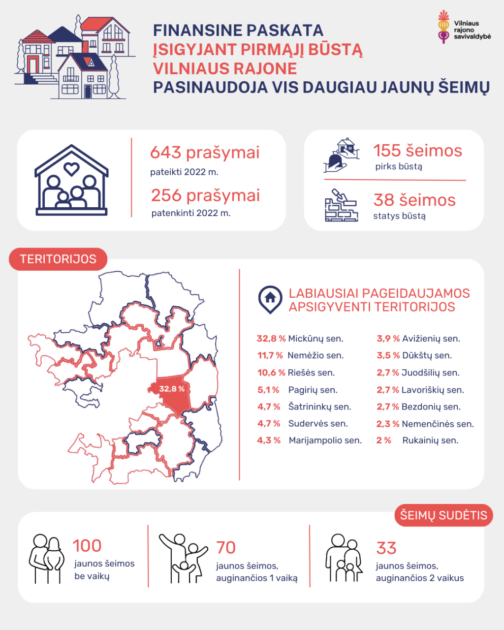 Vilniaus rajono savivaldybės administracija 2022 m. gavo 643 jaunų šeimų prašymus, kurios norėjo pasinaudoti parama būstui įsigyti ir gauti Valstybės siūlomą subsidiją pradiniam įnašui padengti. Iš pateiktų prašymų patenkinti 256 prašymai.