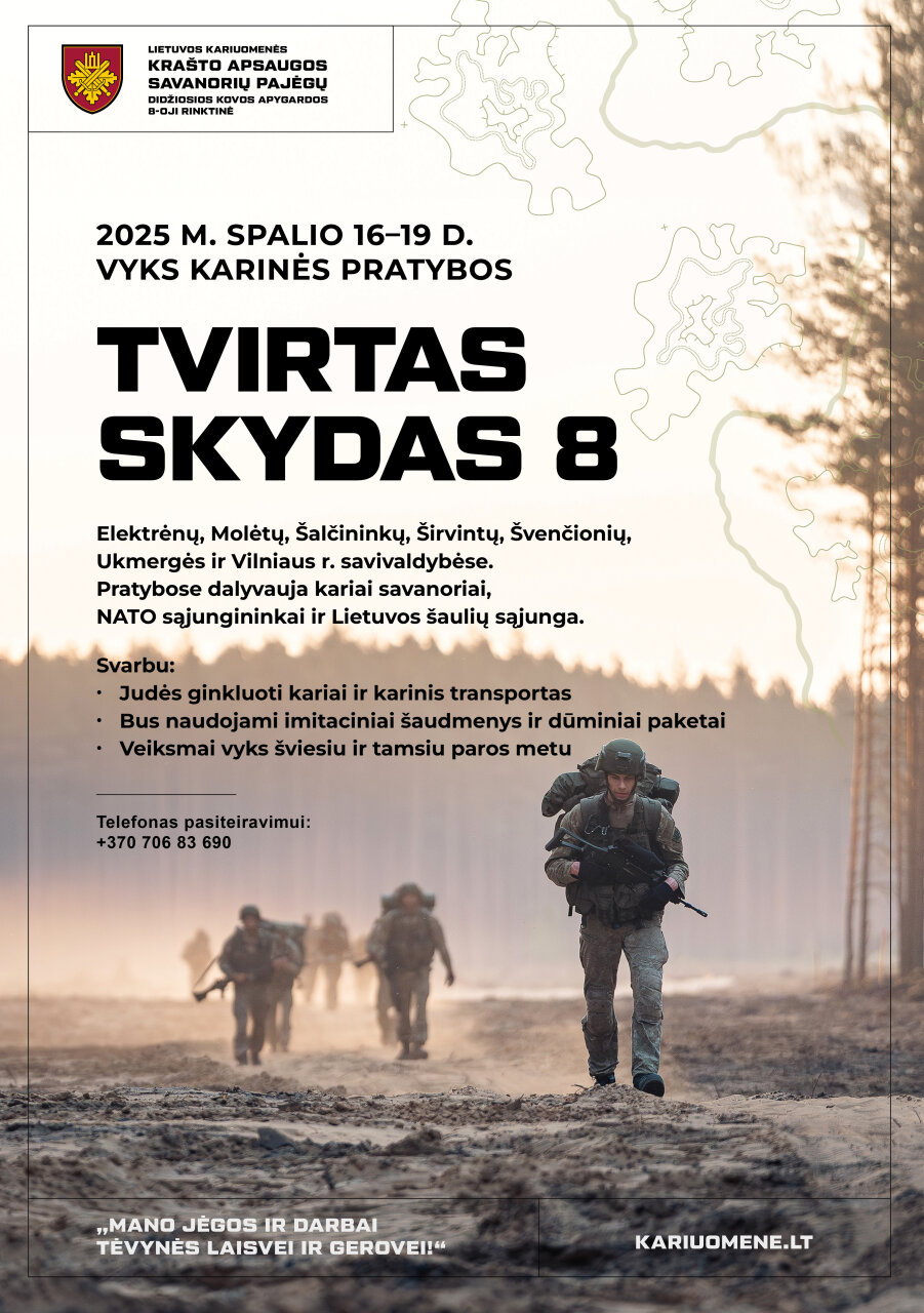 Spalio 16–19 d. Elektrėnų Vievio sen., Molėtų, Šalčininkų Gerviškių sen., Širvintų, Švenčionių, Ukmergės ir Vilniaus r. savivaldybėse vyks Krašto apsaugos savanorių pajėgų pratybos „Tvirtas skydas 8“.