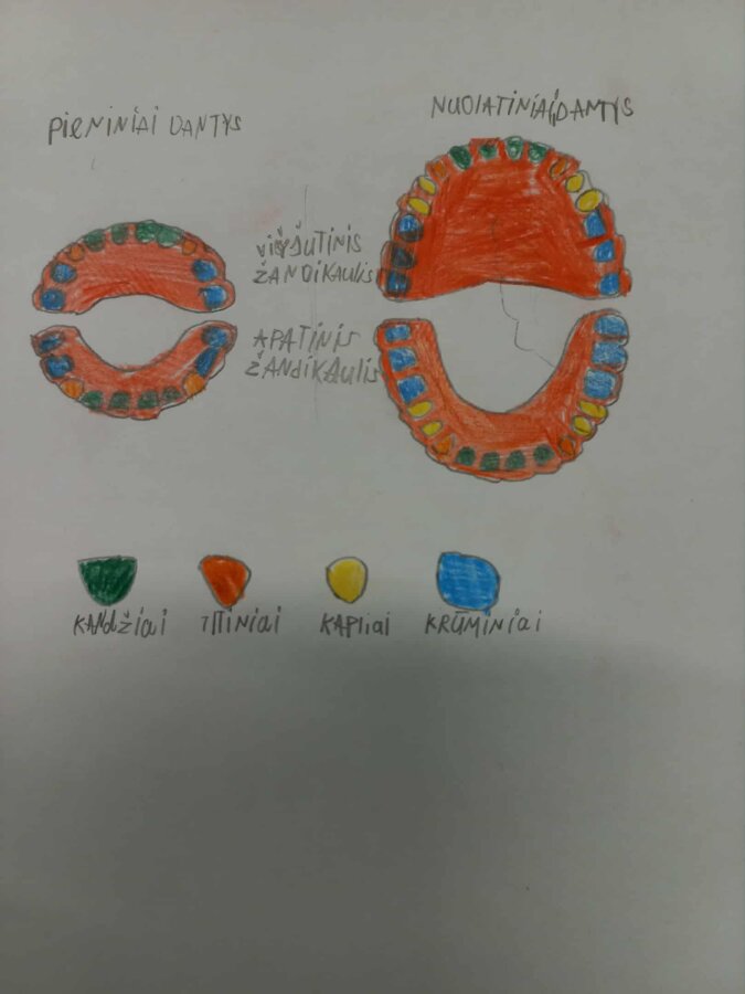 Labiausiai projekto dalyviams patiko lipdyti dantukų muliažus iš plastelino ir modelino, juos spalvinti ir sužymėti visų dantukų pavadinimus. Ši kūrybinė veikla padėjo vaikams geriau pažinti dantų sandarą, lavinti smulkiąją motoriką, ugdyti kūrybiškumą ir bendravimo įgūdžius. Mokiniai gilinosi į nagrinėjamą problemą surasdami sprendimo būdus, kaip saugoti ir prižiūrėti savo dantukus. Projektui pasibaigus visi dalyviai gavo dovanų ir pažadėjo, kad nuo šiol tinkamai valys savo dantukus ir juos labai saugos.