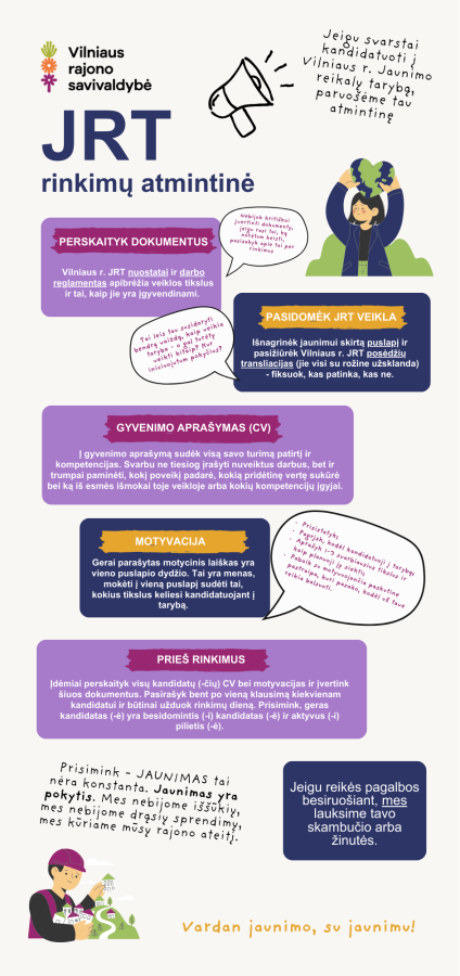 Tau 14–29 metai? Atstovauji jaunimo organizacijai, neformaliai grupei arba tiesiog nori įsitraukti į savivaldos veiklas? Vilniaus rajono savivaldybė kviečia aktyvų, kūrybingą ir pilietišką jaunimą prisidėti prie svarbių sprendimų priėmimo – skelbiami jaunimo atstovų į Jaunimo reikalų tarybą rinkimai.