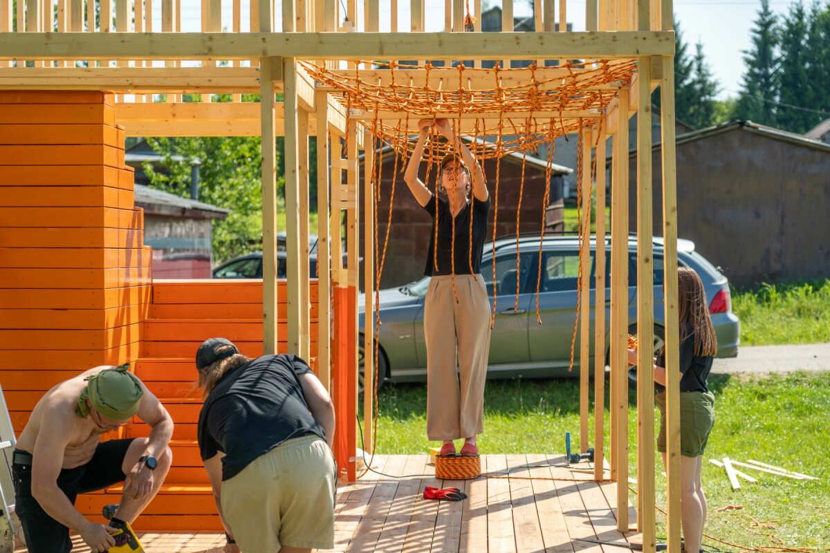 Atvirą konkursą surengė viešoji įstaiga “Architektūra ir žmonės” kartu su vietos partneriais: Vilniaus rajono savivaldybės Centrinės bibliotekos Rudausių struktūrinio padaliniu ir Vilniaus r. Nemenčinės lopšelio-darželio „Šimtas spalvų” skyriaus Rudausių daugiafunkciu centru. Projektą finansuoja Lietuvos kultūros taryba. Projektas „Vaikų kiemas” įgyvendintas laikantis tvarios architektūros principų: naudotos paprastos, bet ilgaamžės medžiagos, vengta perteklinių sprendimų, o visi darbai atlikti bendruomeniškai, įtraukiant vietos vaikus ir jaunimą. Konkurse dėmesys skirtas ne tik fizinei aplinkai, bet ir socialinei darnai: procesas grįstas atsakingu dizainu, orientuotu į vietos kontekstą ir bendruomenės įgalinimą. Tokia metodika įgyvendinti 2023 m. projektai buvo įvertinti Nacionaliniuose architektūros apdovanojimuose už tvarų požiūrį ir prasmingą poveikį vietos bendruomenėms.