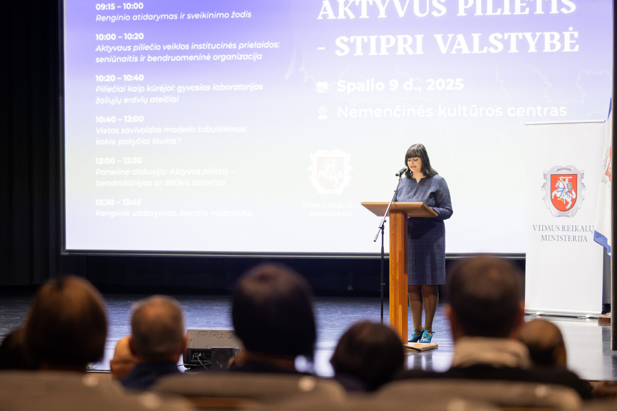 Spalio 9 d., ketvirtadienį, Nemenčinės kultūros centre vyko Lietuvos Respublikos vidaus reikalų ministerijos organizuota konferencija „Aktyvus pilietis – Stipri valstybė 2025“, kurioje susibūrė daugiau nei 200 dalyvių, besidominčių savivaldos aktualijomis ir veikiančių šioje srityje.