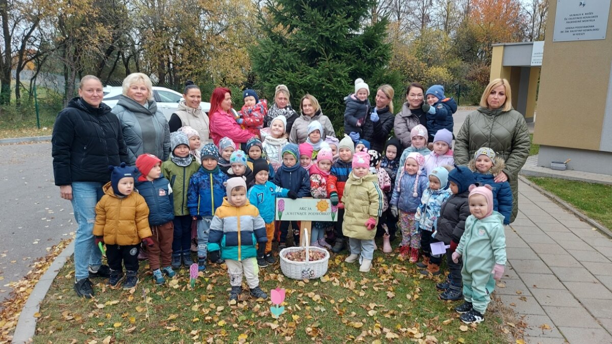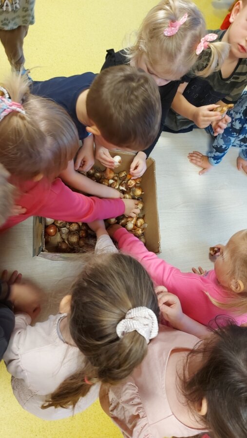 Jesień – to odpowiedni czas na sadzenie cebulek kwiatowych. Aby wiosną było ładnie i kolorowo, trzeba już jesienią przystąpić do prac ogrodniczych. W tym celu, została zrealizowana akcja „Kwitnące podwórko”. Do realizacji akcji, byli zaangażowani również rodzice, którzy wspólnie z dziećmi przynosili cebulki kwiatowe. Na zajęciach przedszkolaki zapoznały się z teorią sadzenia cebulek oraz w jaki sposób należy je pielęgnować. Przypomniały sobie procesy zachodzące w pzyrodzie jesienią i wiosną. Dzieci poznały jak wyglądają prawdziwe cebulki kwiatowe (tulipanów, hiacyntów, narcyzów i krokusów). Zapoznały się z ich budową, kolorem i kształtem. Dowiedziały się jaki kwiat wyrośnie z danej cebulki.