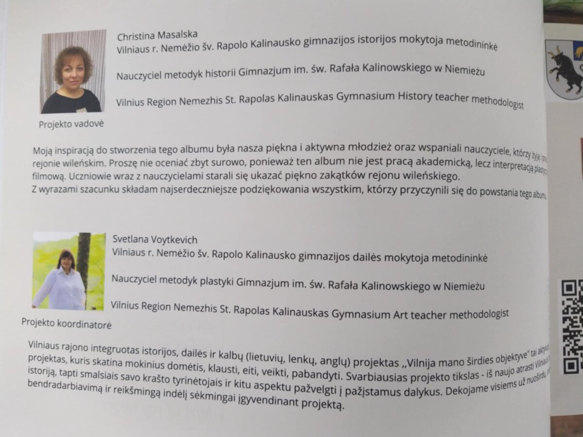 Celem tego przedsięwzięcia było zachęcenie uczniów do bliższego zapoznania się z historią Wileńszczyzny, pogłębienie ich wiedzy o kulturze i tradycjach tego regionu, rozwój zdolności artystycznych. Pracując wspólnie z nauczycielami nad wydaniem albumu reprezentacyjnego, młodzież doskonaliła umiejętności filmowania, tworzenia raportów, publicznego prezentowania efektów swej działalności. Piękny, kolorowy album zawiera rysunki uczniów, opracowane teksty i kody QR, które po zeskanowaniu będą wyświetlać nagrane przez uczniów reportaże. Z całą pewnością ten album można zaliczyć do kreatywnych i wyróżnić jego nowoczesny wygląd, w którym przeplatają się tradycyjne metody z nowoczesnymi technologiami.