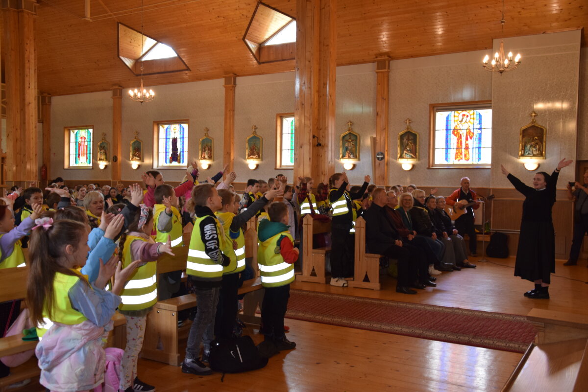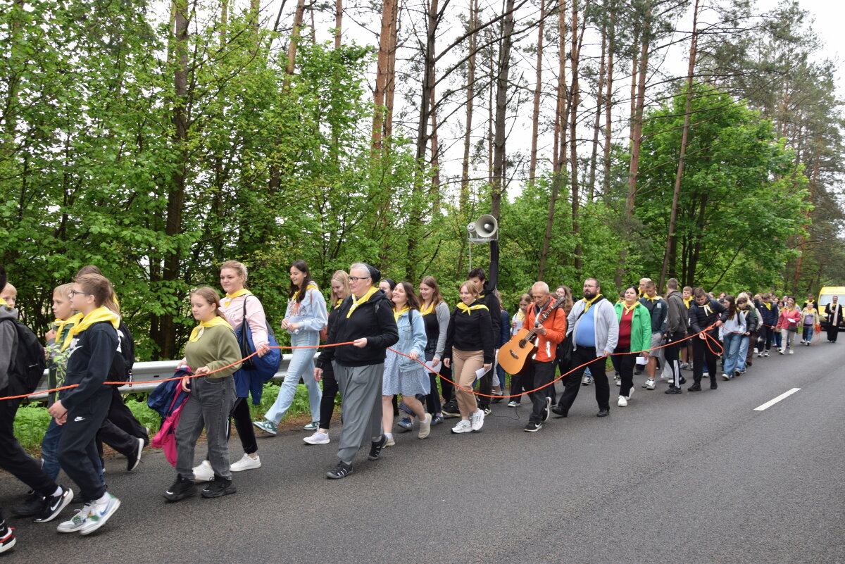 Śpiew prowadził pan Romek wraz z s. Irmą oraz naszymi uczennicami – w szczególności Urszulą i Agatą z klasy 4. Nawet najmłodsi uczniowie z klasy 1 dzielnie przeszli całą trasę, wykazując się zaangażowaniem i dziecięcą radością.