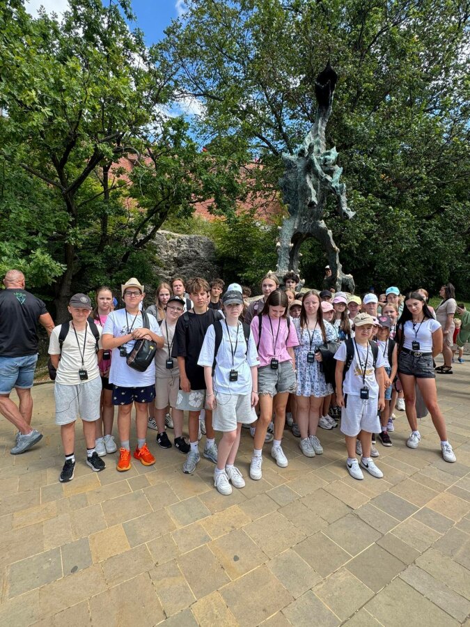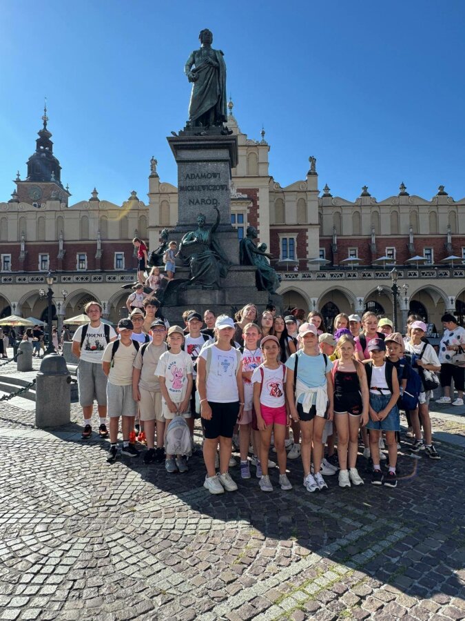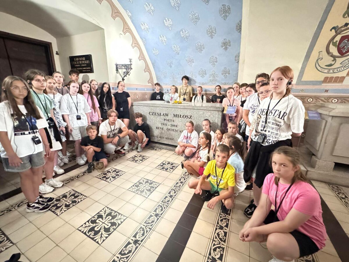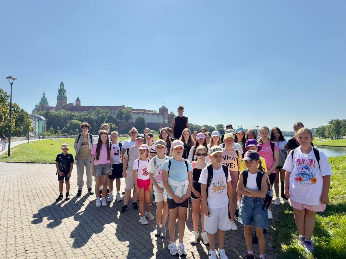 Program kolonii był bogaty i różnorodny. Uczestnicy odwiedzili Kopalnię Soli w Wieliczce, gdzie podziwiali wykute w soli kaplice i komory, podziemne jeziora, imponujące konstrukcje ciesielskie oraz unikalne solne rzeźby. Zwiedzanie odbywało się trasą liczącą blisko 3 kilometry krętych korytarzy i ponad 800 schodów, prowadzących aż 135 metrów w głąb ziemi. Było to dla wszystkich niezwykłe spotkanie z jednym z cudów światowego dziedzictwa. Poza tym koloniści bawili się w Energylandii, a także udali się na wycieczkę do Krakowa. Szczególnym momentem było nawiedzenie Krypty Zasłużonych na Skałce, gdzie spoczywa patron szkoły – Czesław Miłosz. W uroczystej atmosferze przewodniczka przypomniała jego życiorys, a w murach świątyni zabrzmiały fragmenty poezji noblisty. Dla wielu był to wzruszający i niezapomniany akcent wyprawy. Spacer Traktem Królewskim pozwolił młodym turystom lepiej poznać historię i zabytki Krakowa. Nie mogło też zabraknąć spotkania ze smokiem wawelskim – przy jego pomniku wykonano pamiątkowe zdjęcie całej grupy. Niezwykłych emocji dostarczyła także wizyta w Krakow Arcade Museum – Interaktywnym Muzeum Gier Wideo.
