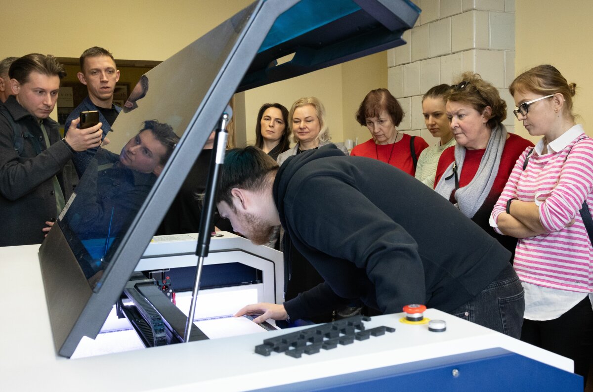 Następnie wydarzenie przeszło do części praktycznej, która dała uczestnikom możliwość zapoznania się z nowoczesnymi technologiami edukacyjnymi, takimi jak grawerki laserowe, ściany interaktywne, wirtualne koszulki oraz tablety graficzne.