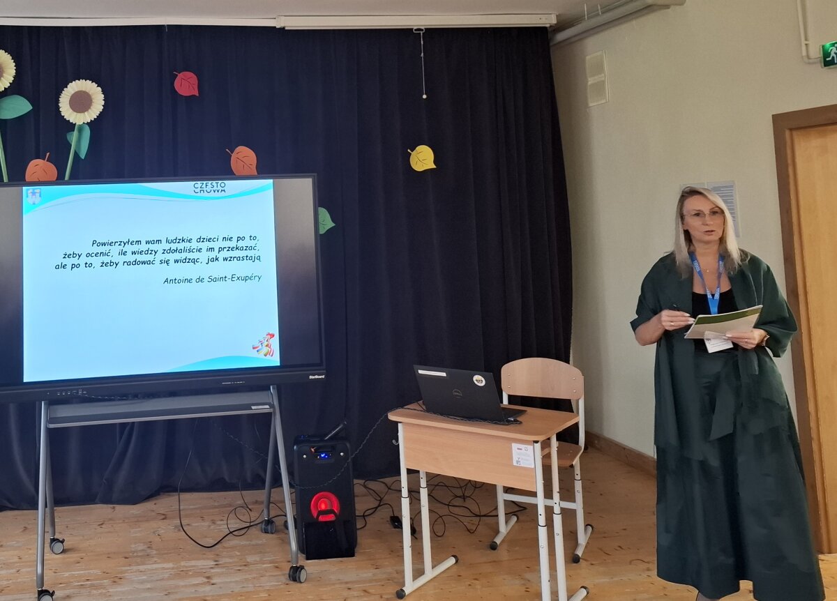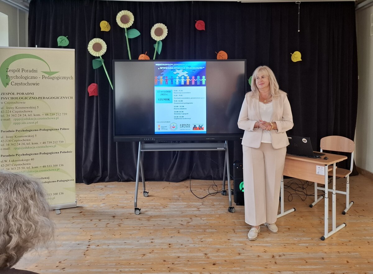 Zgromadzonych na sali uczestników konferencji gorąco powitała dyrektor Szkoły Podstawowej w Szumsku Inesa Korwiel, która ukazała podstawowe zagadnienia omawianego tematu. W prezentacji multimedialnej, jaką przedstawiła, wybrzmiała myśl przewodnia, że każde działanie na rzecz dobra dziecka, to schodek wzwyż w nauczaniu włączającym. Przedstawiła również prelegentów z Zespołu Psychologiczno-Pedagogicznych w Częstochowie, dyrektorów szkół w Częstochowie. W sposób wirtualny uczestników międzynarodowej konferencji naukowej powitała Janina Klimaszewska, starszy specjalista Wydziału Oświaty Samorządu Rejonu Wileńskiego. Zaznaczyła, że naszym wspólnym zadaniem jest troska o to, by edukacja była rzeczywiście dla wszystkich, a jednocześnie dla każdego z osobna i żeby każde dziecko w naszych szkołach mogło otrzymać odpowiadającą jego potrzebom ofertę.