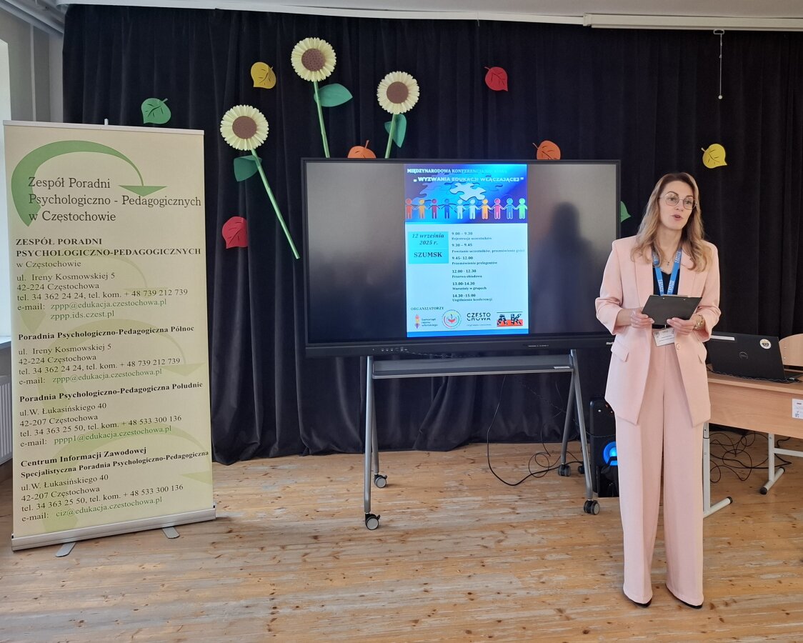 Uczestnicy konferencji naukowej z wielkim zaciekawieniem wysłuchali referatu wicedyrektor Zespołu Psychologiczno-Pedagogicznych w Częstochowie Małgorzaty Krakowskiej, która przedstawiła podstawowe założenie edukacji włączającej: poznaj dziecko, zaakceptuj, a potem pracuj. Zgromadzeni na sali mieli możliwość zapoznać się z informacją na temat uzyskania opinii o wspomaganiu rozwoju dziecka , o niezbędnych procedurach do uzyskania orzeczenia. Prelegentka przybliżyła działania i zadania Poradni Psychologiczno-Pedagogicznej.