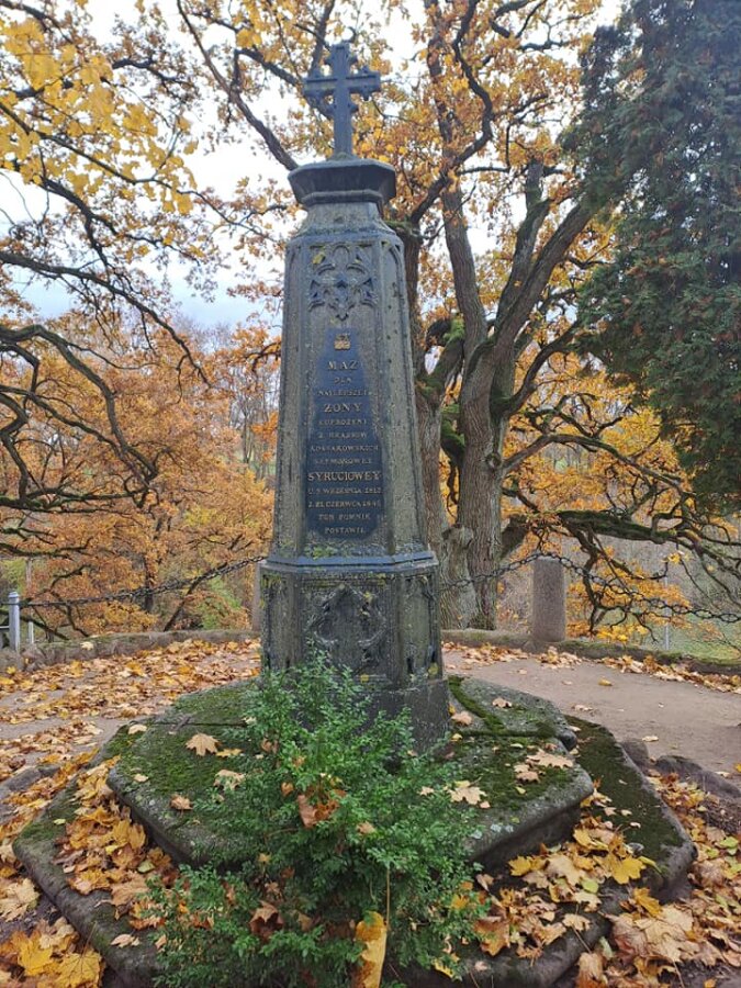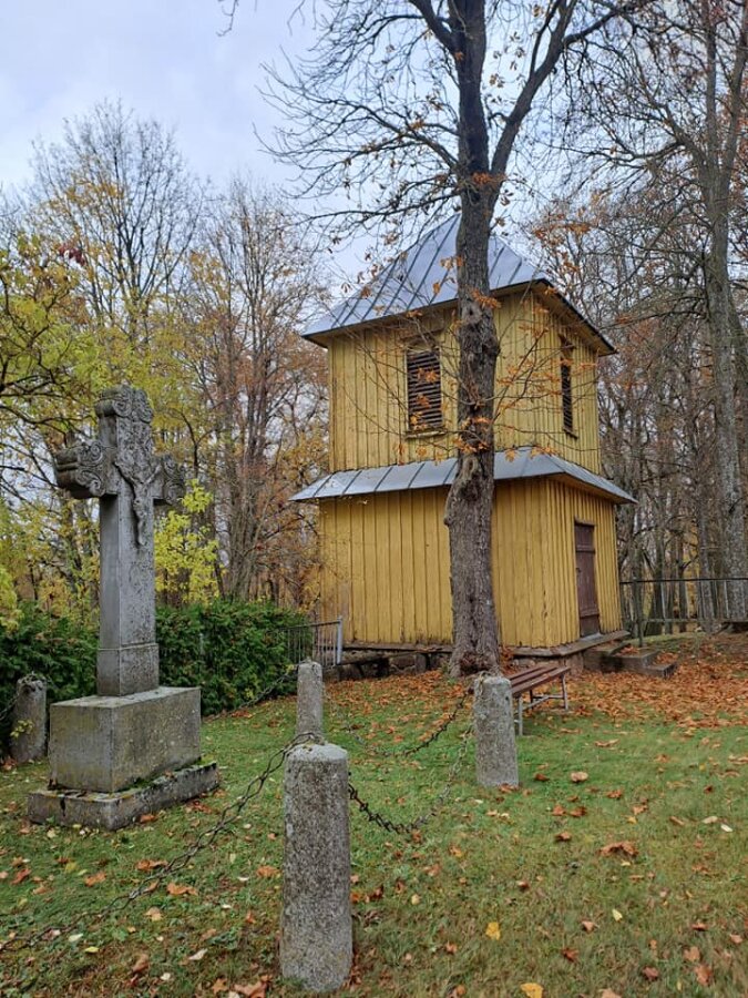 Obok kościoła znajduje się stary cmentarz. Na wysokiej skarpie, w cieniu rozłożystego dębu, stoi obelisk ogrodzony łańcuchami – miejsce wiecznego spoczynku Szymona Syrucia (1807–70), pradziada poety i właściciela Szetejń. Na nagrobku widnieje napis: „Mąż dla naylepszey żony Eufrozyny z hrabiów Kossakowskich Szymonowey Skiruciowey”. W tym miejscu zapaliliśmy znicze.
