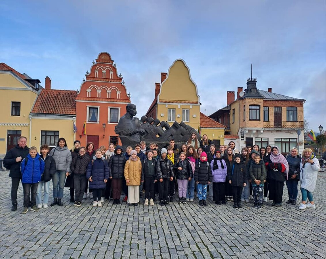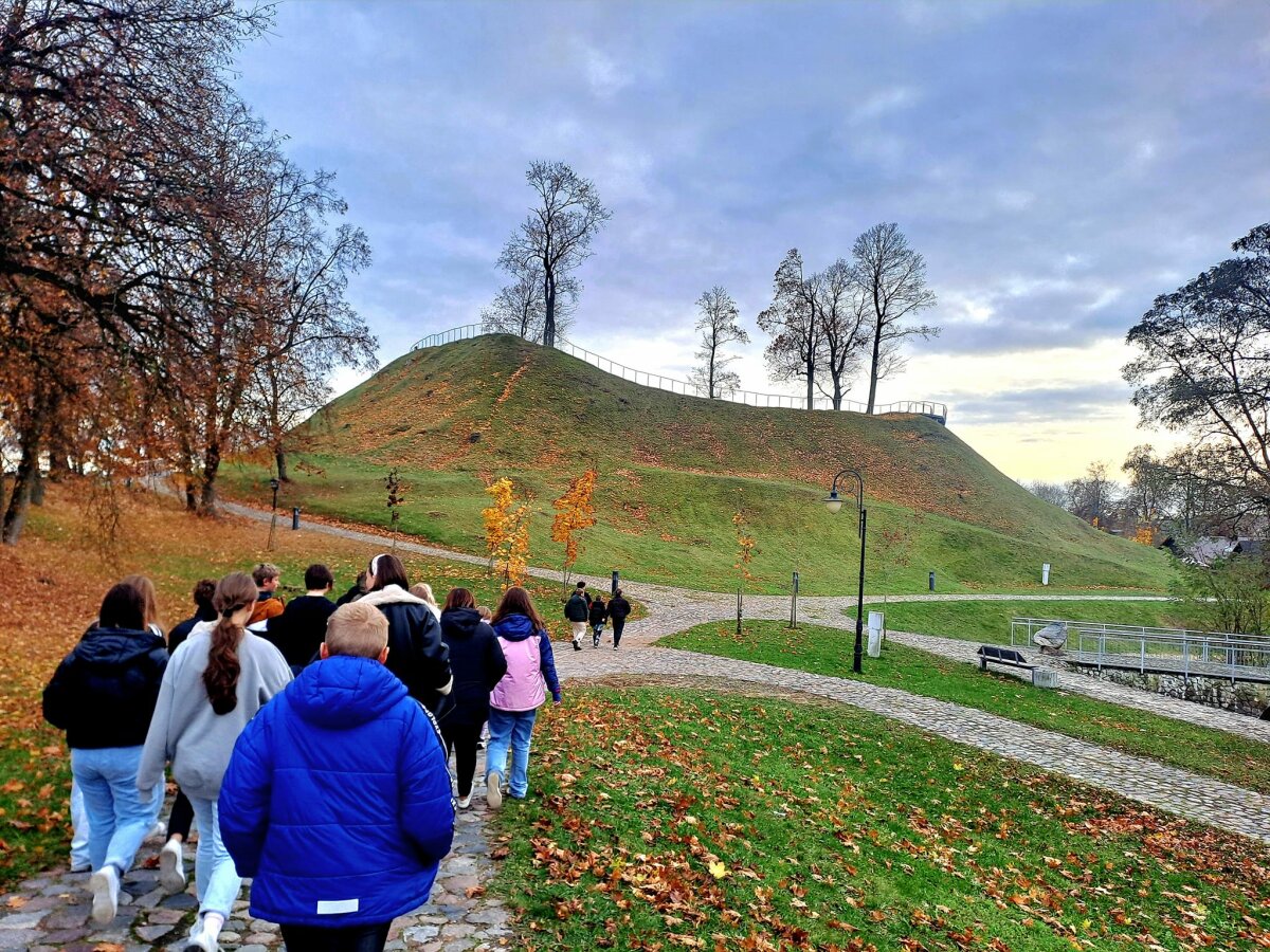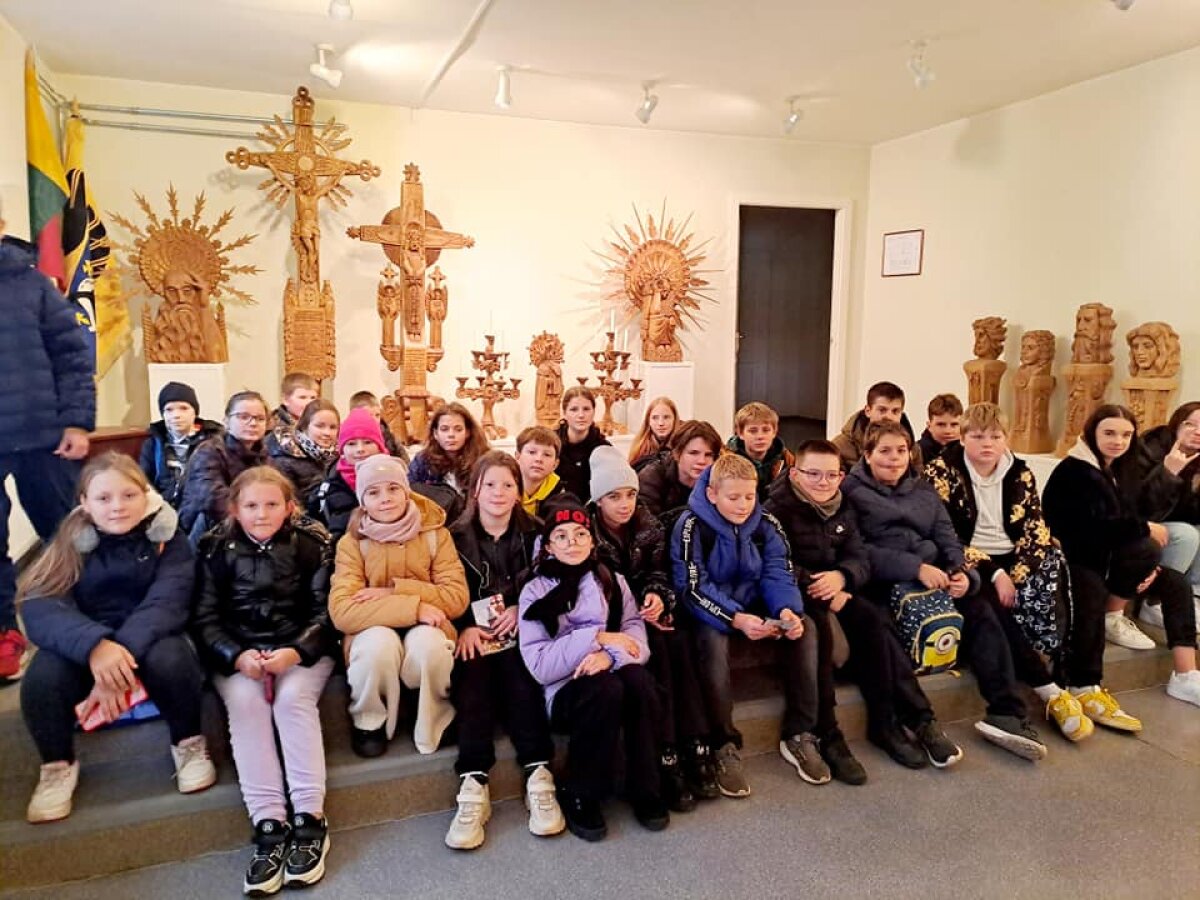 Naszą podróż rozpoczęliśmy od Kiejdan, jednego z najstarszych miast na Litwie, położonego na malowniczym terenie. Jak wyjaśniła pani przewodnik, Irena Duchowska, Kiejdany rozkwitły dzięki rodowi Radziwiłłów, a ich nazwa wywodzi się od nazwiska legendarnego kupca Keidangena, który miał założyć tu wioskę rybacką. Miasto zachowało wiele ze swojego historycznego charakteru — brukowane uliczki, targowiska oraz jedną z perełek architektury – barokowy kościół karmelitów pw. św. Józefa. Co ciekawe, mówi się, że kościół ten został wzniesiony bez użycia choćby jednego gwoździa, co czyni go jeszcze bardziej wyjątkowym i budzi podziw odwiedzających. W Kiejdanach odwiedziliśmy również wystawę prac rzeźbiarza V. Ulevičiusa, zorganizowaną w budynku samorządu miejskiego. Niezwykłe szachy, przedstawiające bitwę pod Grunwaldem, zaskoczyły nas detalami i precyzją wykonania. To niesamowite, jak sztuka potrafi uchwycić historię w formie materialnej, podobnie jak poezja potrafi uchwycić życie w słowach. Następnie udaliśmy się do Gimnazjum „Światłe” (lit. „Šviesioji” gimnazija), którego architektura nawiązuje do wspaniałych budowli wileńskich. Główną ozdobą szkoły jest wewnętrzny dziedziniec pod szklaną kopułą, otoczony łukami przypominającymi Uniwersytet Wileński. Spacerując po mieście, odkrywaliśmy kolejne uroki Kiejdan, szliśmy ulicą Cz. Miłosza, podziwialiśmy krzesło (lit. „Milošofonas”) sprezentowane dla Miłosza jako honorowego obywatela Kiejdan, a zakończyliśmy wizytę pysznym obiadem w „Domu Greja” na starówce.
