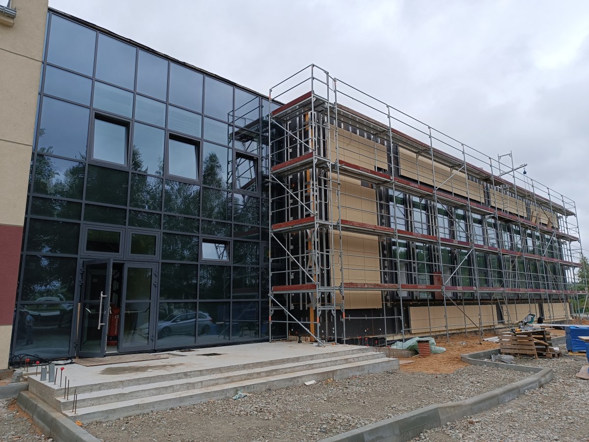 W dwupiętrowej dobudówce, której prace budowlane rozpoczęły się w czerwcu 2022 r., oprócz sali sportowej, znajdzie się również szatnia, prysznic, toalety, pokój nauczycieli oraz scena. Dobudówkę zaprojektowano od strony boiska sportowego z osobnym wejściem i dojazdem.