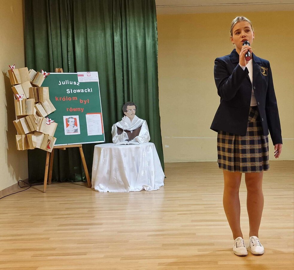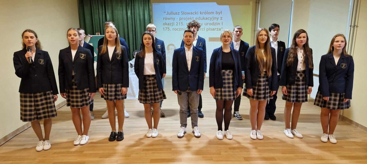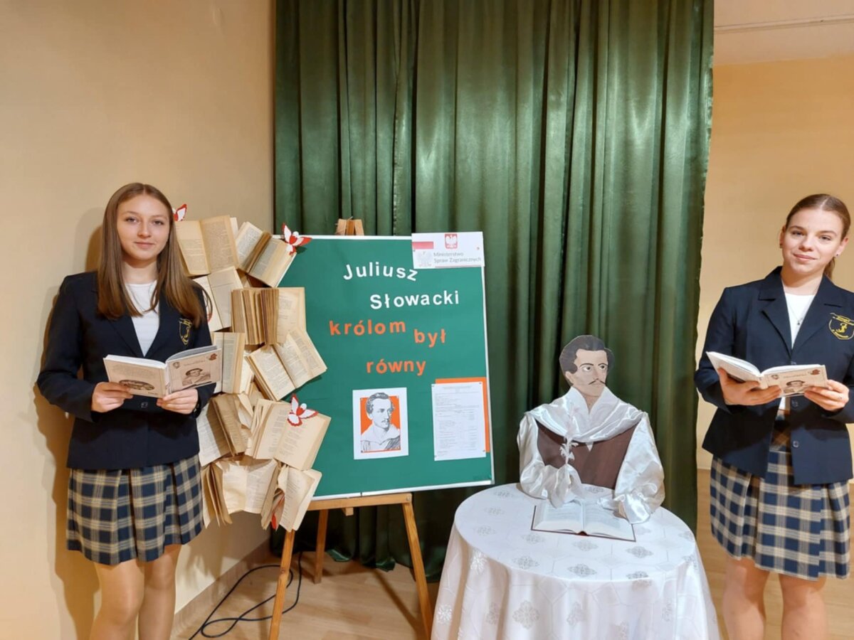 W ramach projektu zostały zorganizowane zajęcia z języka polskiego i literatury o Juliuszu Słowackim. Odbył się szkolny konkurs ortograficzny pt. „Juliuszowe dyktando” dla uczniów klas 5-10, w którym tytuł „Mistrza ortografii” walczyło 60 osób. Równolegle odbył się konkurs wiedzy o patronie gimnazjum zatytułowany „Juliuszada”. Uczestnicy musieli wykazać się znajomością biografii poety i jego dzieł. Konkurs ten okazał się doskonałą okazją do pogłębienia wiedzy o jednym z największych polskich poetów. Natomiast uczniowie klas III-IVG wzięli udział w Narodowym Czytaniu „Kordiana” – jednego z najważniejszych dramatów Juliusza Słowackiego. Wspólne czytanie fragmentów dzieła przybliżyło młodym uczestnikom jego treść i głębokie przesłanie. Zwycięzcy konkursów zostali uhonorowani dyplomami oraz upominkami, które podkreśliły ich zaangażowanie i wysiłek włożony w przygotowania.