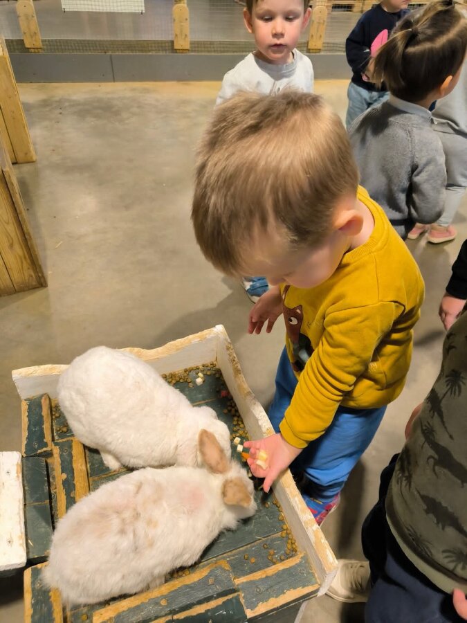 Ogromną radość sprawiło dzieciom karmienie króliczków i rybek. Robiły to bardzo ostrożnie i z dużym zainteresowaniem. Z ciekawością obserwowały, jak rybki pływają wokół, a króliczki z apetytem chrupią podany pokarm.
