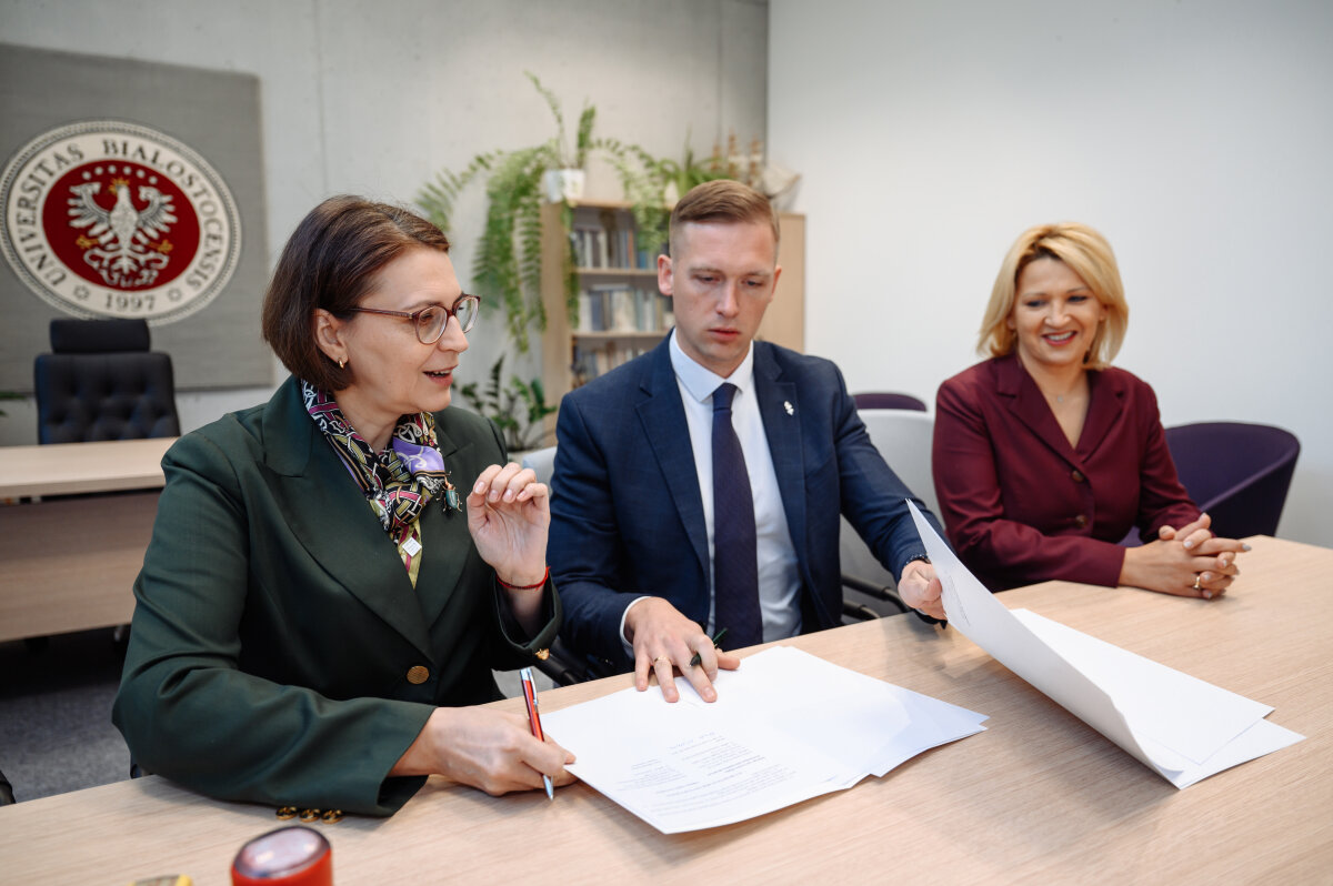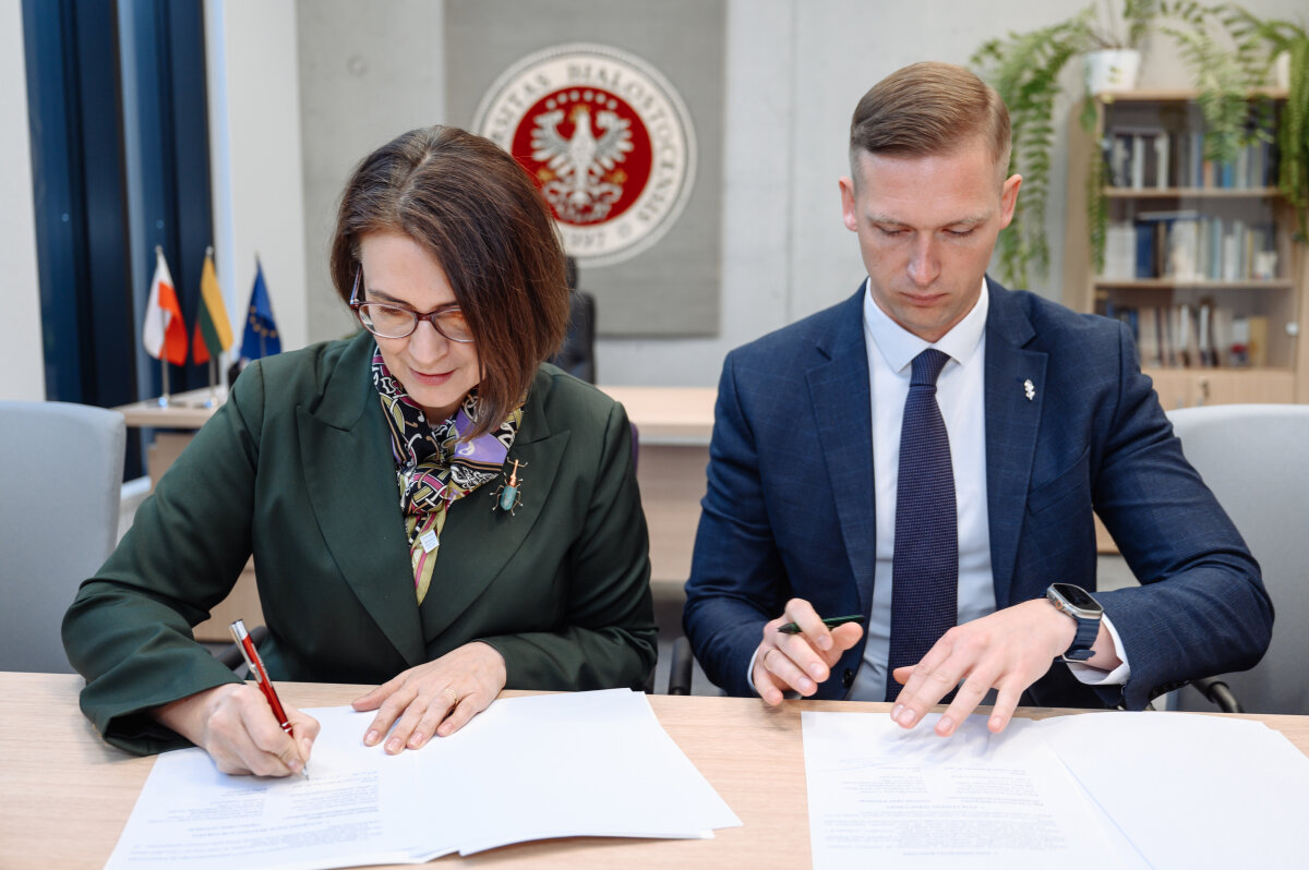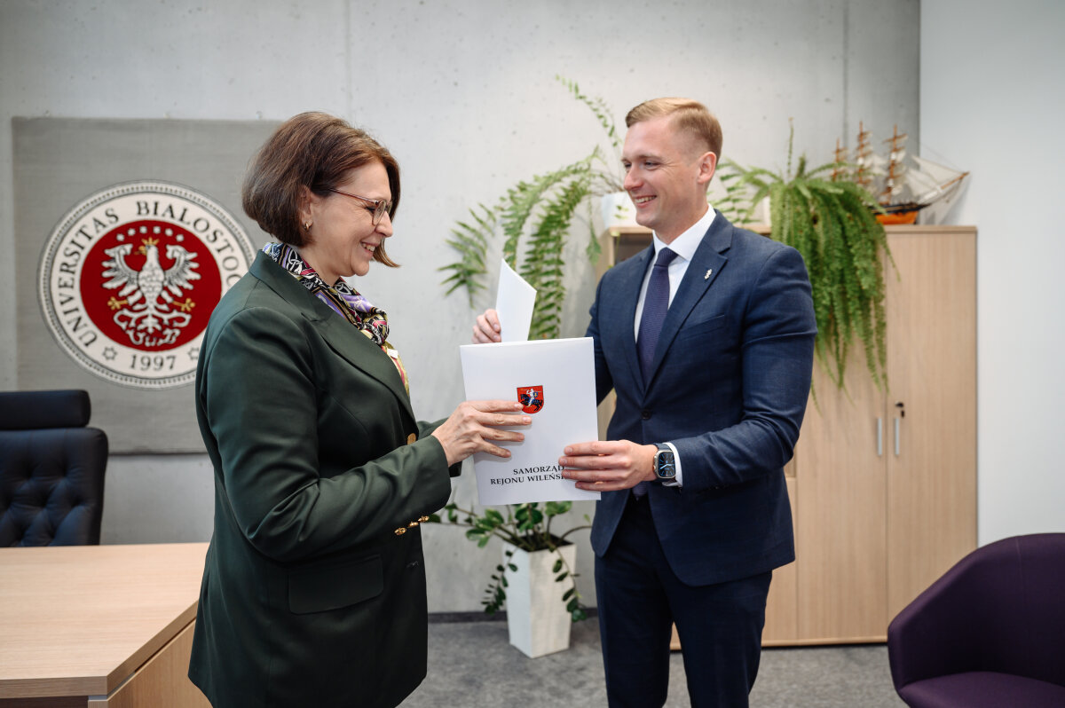 Umowę o współpracy podpisali dr hab. Urszula Wróblewska, prof. UB, dziekan Wydziału Ekonomiczno-Informatycznego Filii Uniwersytetu w Białymstoku w Wilnie, oraz Robert Duchniewicz, mer rejonu wileńskiego.
