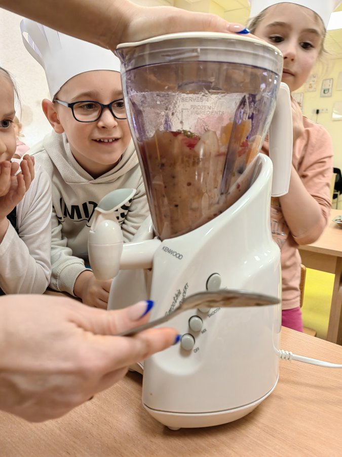 Natomiast w piątek dzieci do przedszkola przyniosły swoje ulubione owoce i zamieniły się w kucharzy. Podczas zajęć określano kształt, kolor, wielkość oraz nazwę owoców. Przedszkolaki miały dużo pracy, gdyż każdy samodzielnie kroił owoce na kawałki oraz nadziewał na patyczki, tworząc pyszne i zdrowe szaszłyki owocowe. Po skończonej pracy wszystkie dzieci ze smakiem zjadły owocowe przysmaki. Przedszkolakom bardzo smakowała własnoręcznie wykonana potrawa. Z pozostałych owoców postanowiono zrobić koktajl: dzieci pomagały wkładać owoce do miksera, a następnie przyglądały się, jak zostają rozdrobnione na jednolitą masę.