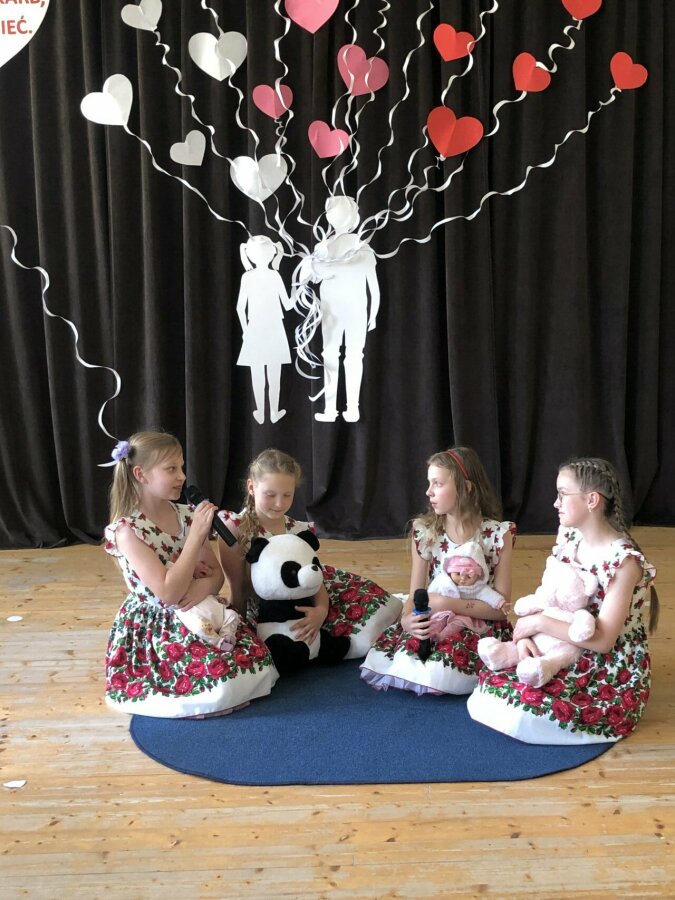 Scena na uroczystość była udekorowana w sposób niezwykle symboliczny i pełen ciepła. Na centralnej ścianie zawisł plakat w kształcie serca, na którym widniał wzruszający cytat: „Rodzina – to najcenniejszy skarb, jaki możemy mieć”. To piękne przesłanie było sercem całego wydarzenia, przypominając wszystkim zgromadzonym o sile rodzinnych więzi. Obok plakatu umieszczono aplikacje przedstawiające dzieci, od których jakby unosiły się w górę małe kolorowe serca, symbolizujące ich miłość i radość. Cała dekoracja tworzyła niezwykle ciepłą i wzruszającą atmosferę, podkreślając znaczenie rodzinnych wartości i uczucia, które towarzyszyły każdemu występowi tego wyjątkowego koncertu.