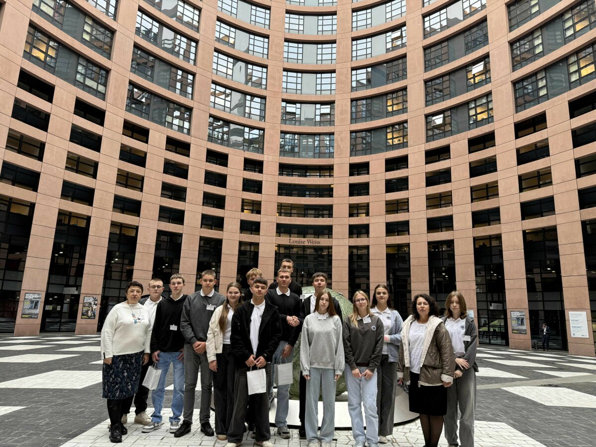 Kontynuując działania w ramach projektu, uczniowie klas II–IV naszego gimnazjum, pod opieką nauczycieli, wspólnie z rówieśnikami i nauczycielkami z Gimnazjum „Šilas”, wyruszyli w podróż po Europie. Najważniejszym celem wyjazdu była wizyta w Parlamencie Europejskim w Strasburgu, która stała się kulminacyjnym punktem całej podróży. Podczas wizyty odbyło się spotkanie z europosłem Petrasem Auštrevičiusem. Poznaliśmy rolę Parlamentu w procesie prawotwórczym oraz sposób, w jaki powstają decyzje kształtujące przyszłość Europy. Spotkanie było nie tylko pouczające, lecz także inspirujące – wielu z nas zrozumiało, że każdy obywatel Europy, nawet młody człowiek, może mieć wpływ na przyszłość swojego kraju i całego kontynentu.