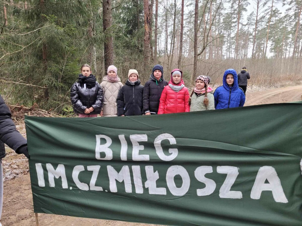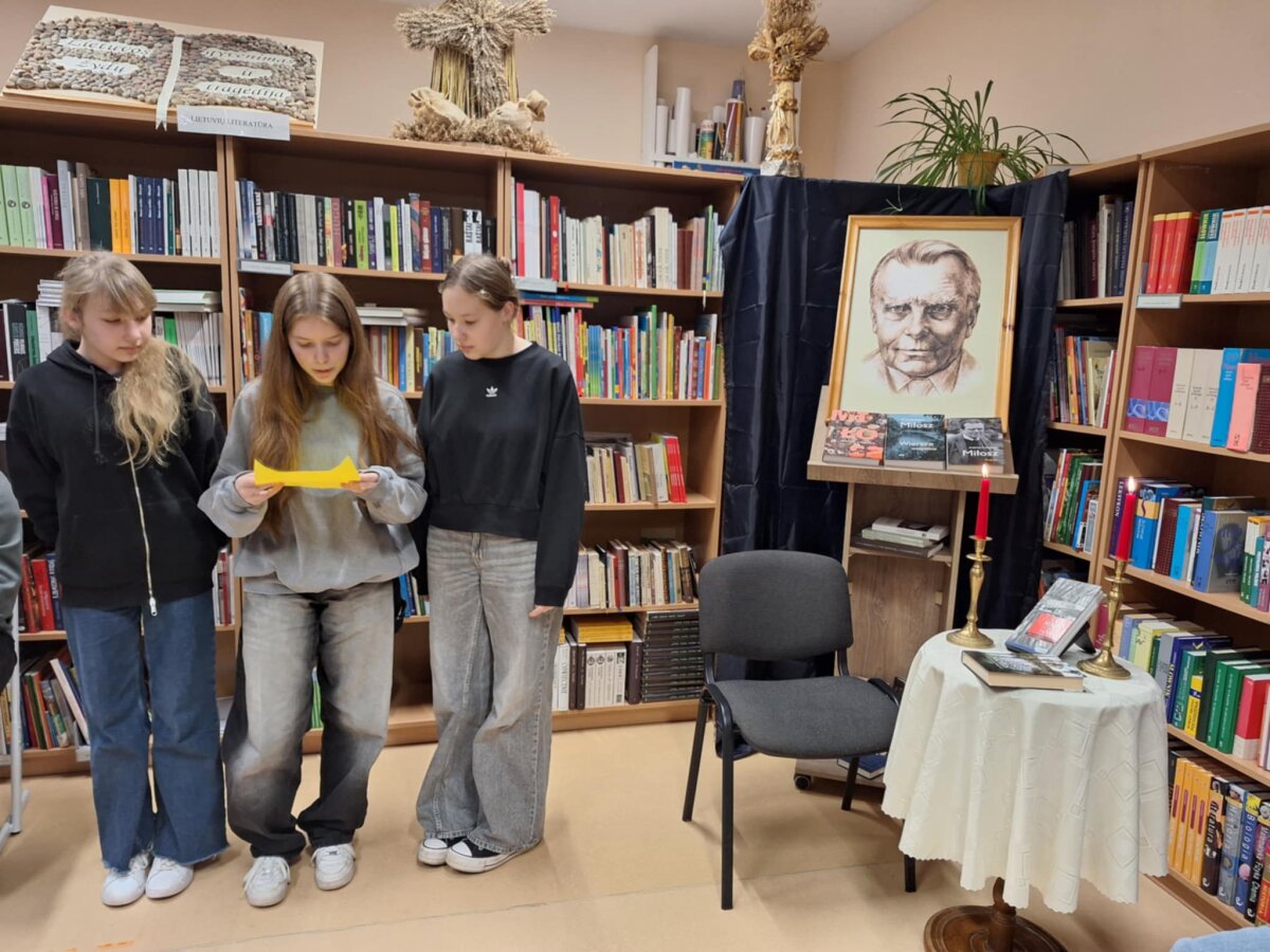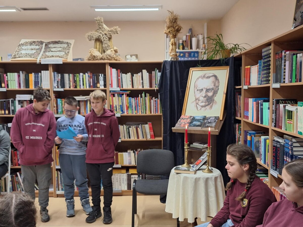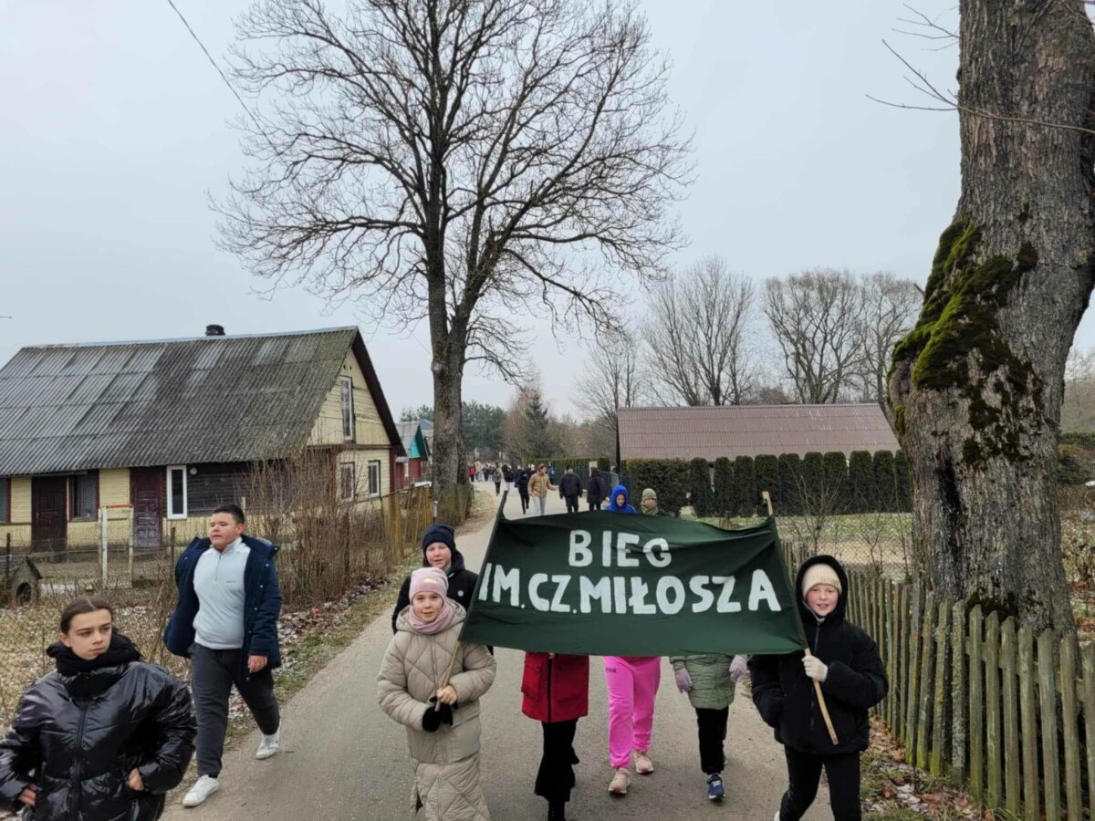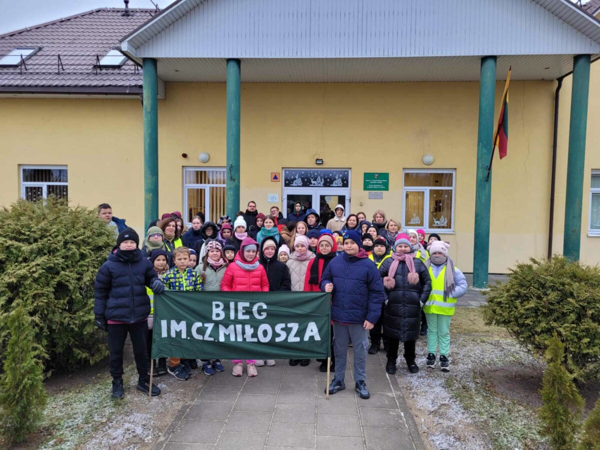 Poznawać Patrona szkoły dzieci rozpoczynają od najmłodszych. Przedszkolaki zapoznały się z Patronem szkoły poprzez układanie puzzli z wizerunkiem Cz. Miłosza. Uczniowie klas 1-10 wzięli udział w corocznym Biegu im. Cz. Miłosza, który łączył aktywność fizyczną z uczczeniem pamięci Patrona szkoły. Na lekcjach technologii ósmoklasiści wykonali portrety Miłosza techniką pirografii, czyli wypalania na drewnie, co pozwoliło im twórczo zinterpretować postać poety. Na lekcjach plastyki uczniowie klas 8 i 10, inspirowani zdjęciem Patrona szkoły, tworzyli kolaże techniką przeplatanki. Powstały trójwymiarowe portrety poety, które zyskały wyjątkowy, artystyczny wyraz. Na lekcjach języka litewskiego uczniowie klas 6, 8 i 9 stworzyli ilustracje oraz plakat do wierszy Cz. Miłosza. Zajęcia języka polskiego stały się okazją do zgłębienia biografii pisarza oraz historycznego kontekstu, w którym tworzył. Szóstoklasiści, czytając legendy wileńskie, tworzyli plakaty inspirowane miłością poety do przyrody i jego rodzinnych stron. Cz. Miłosz, urodzony nad Niewiażą, nazywał dolinę tej rzeki sercem Litwy i najpiękniejszym miejscem na ziemi. Przyroda litewska była mu szczególnie bliska, dlatego uczniowie w swoich pracach umieszczali elementy takie jak rzeka, wąż czy cytaty z jego twórczości, podkreślając piękno tych krajobrazów i więź poety z miejscem jego urodzenia. Uczniowie klasy 10 zapoznali się z grupą literacką „Żagary”, działającą w okresie dwudziestolecia międzywojennego, do której należał Cz. Miłosz. Poznali idee i cechy tej grupy, przeczytali kilka wierszy noblisty, a następnie obejrzeli film na podstawie książki Miłosza „Dolina Issy”. W bibliotece odbyła się lekcja „Czesław Miłosz na nowo odkryty” dla uczniów klas 5-10. Uczniowie i nauczyciele mieli okazję przeczytać wylosowane wiersze poety zarówno po polsku, jak i po litewsku. Dzięki tej inicjatywie młodzież mogła poznać różnorodne interpretacje poezji Miłosza w obu językach. Uczniowie przedstawili zespołowe interpretacje wybranych utworów, uświadamiając sobie, że poezja Miłosza, pełna uniwersalnych wartości, wciąż jest aktualna.