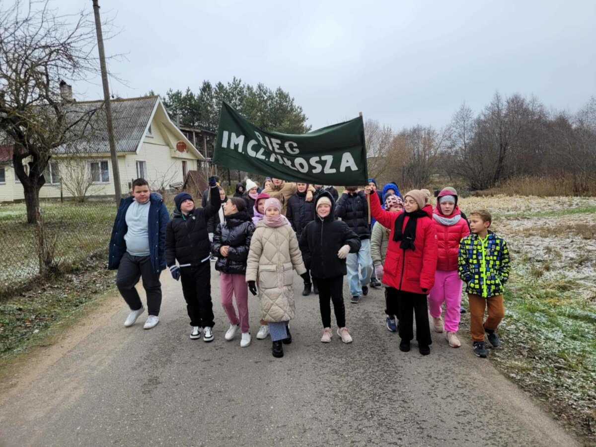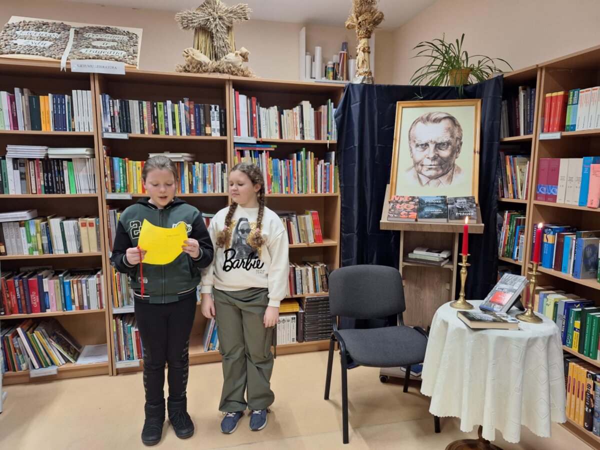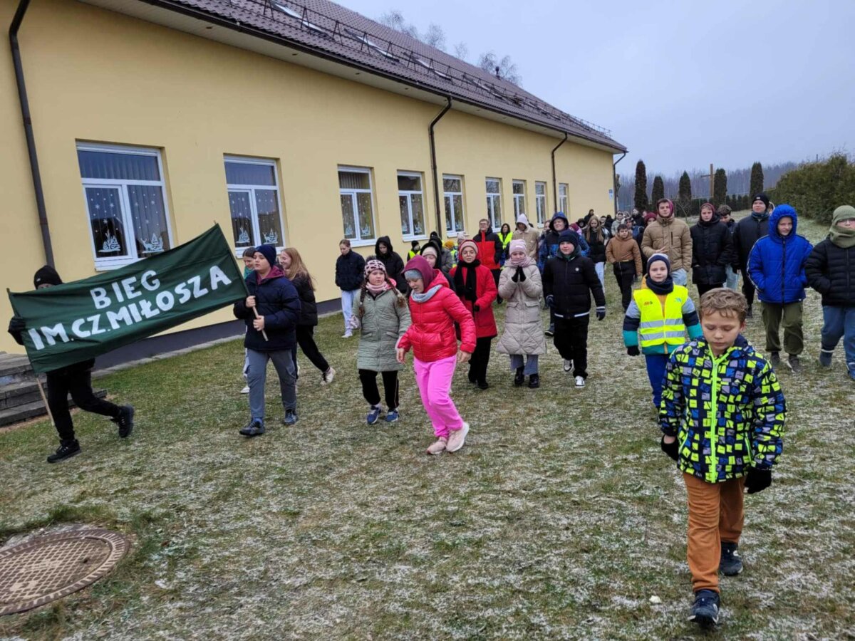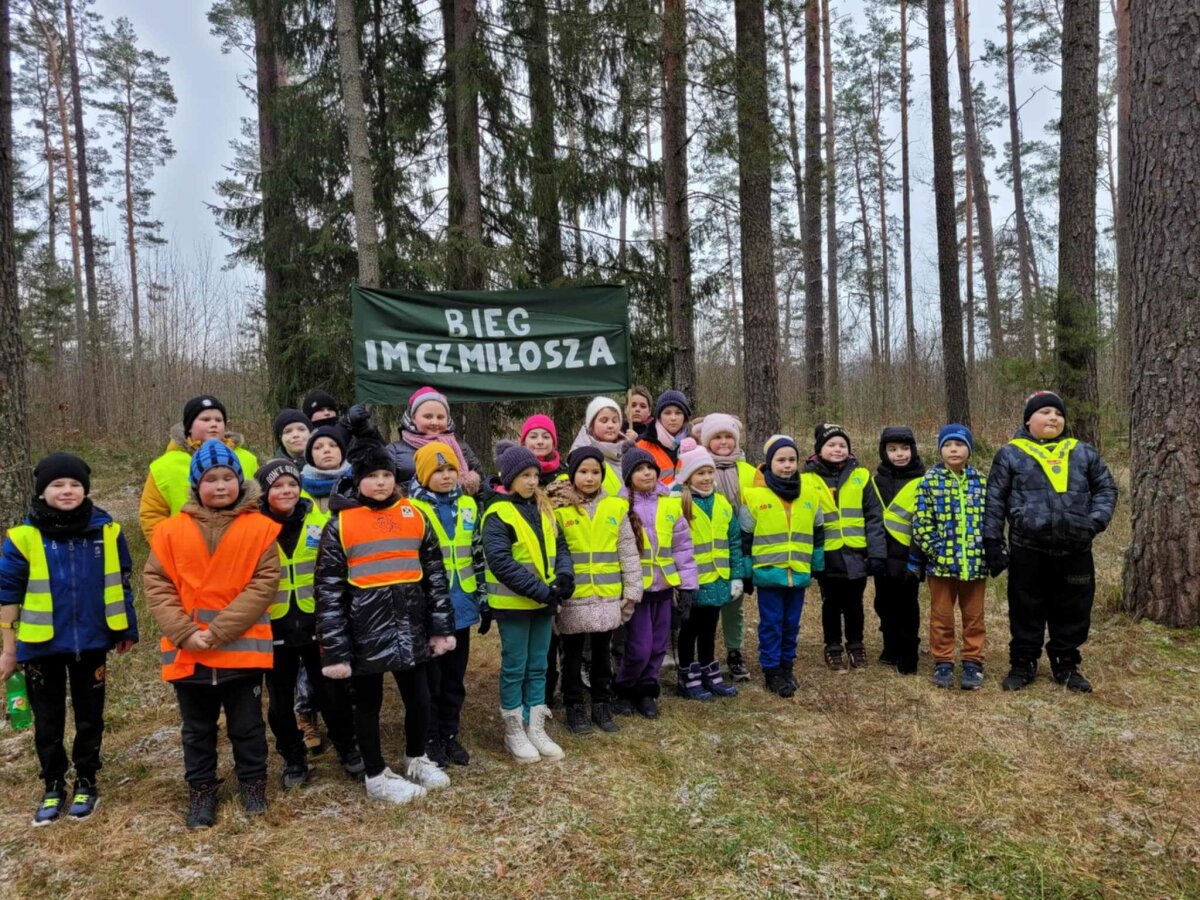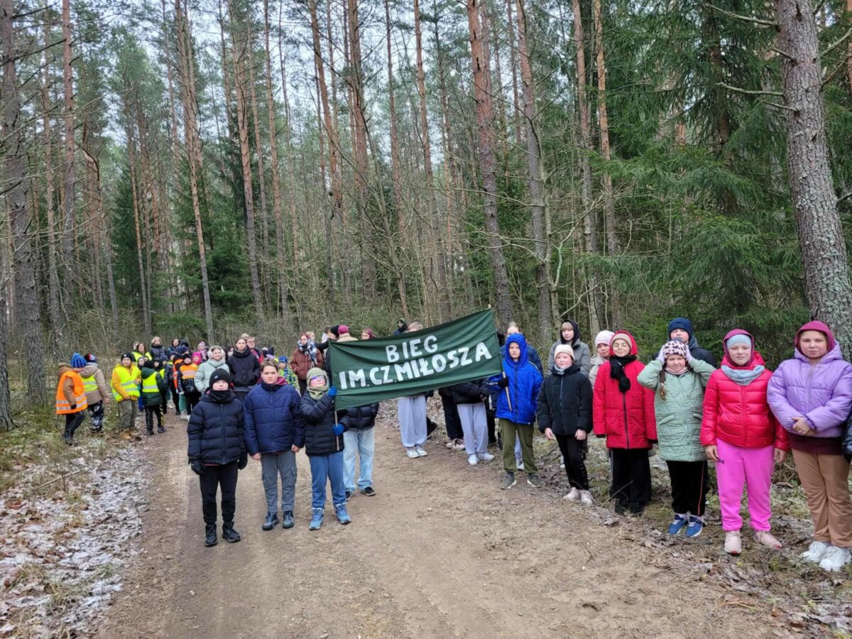 Poznawać Patrona szkoły dzieci rozpoczynają od najmłodszych. Przedszkolaki zapoznały się z Patronem szkoły poprzez układanie puzzli z wizerunkiem Cz. Miłosza. Uczniowie klas 1-10 wzięli udział w corocznym Biegu im. Cz. Miłosza, który łączył aktywność fizyczną z uczczeniem pamięci Patrona szkoły. Na lekcjach technologii ósmoklasiści wykonali portrety Miłosza techniką pirografii, czyli wypalania na drewnie, co pozwoliło im twórczo zinterpretować postać poety. Na lekcjach plastyki uczniowie klas 8 i 10, inspirowani zdjęciem Patrona szkoły, tworzyli kolaże techniką przeplatanki. Powstały trójwymiarowe portrety poety, które zyskały wyjątkowy, artystyczny wyraz. Na lekcjach języka litewskiego uczniowie klas 6, 8 i 9 stworzyli ilustracje oraz plakat do wierszy Cz. Miłosza. Zajęcia języka polskiego stały się okazją do zgłębienia biografii pisarza oraz historycznego kontekstu, w którym tworzył. Szóstoklasiści, czytając legendy wileńskie, tworzyli plakaty inspirowane miłością poety do przyrody i jego rodzinnych stron. Cz. Miłosz, urodzony nad Niewiażą, nazywał dolinę tej rzeki sercem Litwy i najpiękniejszym miejscem na ziemi. Przyroda litewska była mu szczególnie bliska, dlatego uczniowie w swoich pracach umieszczali elementy takie jak rzeka, wąż czy cytaty z jego twórczości, podkreślając piękno tych krajobrazów i więź poety z miejscem jego urodzenia. Uczniowie klasy 10 zapoznali się z grupą literacką „Żagary”, działającą w okresie dwudziestolecia międzywojennego, do której należał Cz. Miłosz. Poznali idee i cechy tej grupy, przeczytali kilka wierszy noblisty, a następnie obejrzeli film na podstawie książki Miłosza „Dolina Issy”. W bibliotece odbyła się lekcja „Czesław Miłosz na nowo odkryty” dla uczniów klas 5-10. Uczniowie i nauczyciele mieli okazję przeczytać wylosowane wiersze poety zarówno po polsku, jak i po litewsku. Dzięki tej inicjatywie młodzież mogła poznać różnorodne interpretacje poezji Miłosza w obu językach. Uczniowie przedstawili zespołowe interpretacje wybranych utworów, uświadamiając sobie, że poezja Miłosza, pełna uniwersalnych wartości, wciąż jest aktualna.