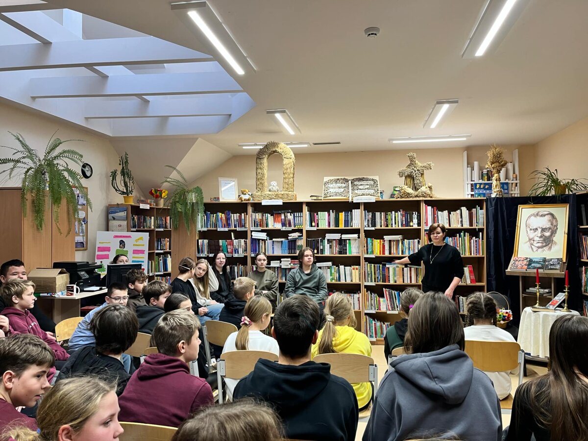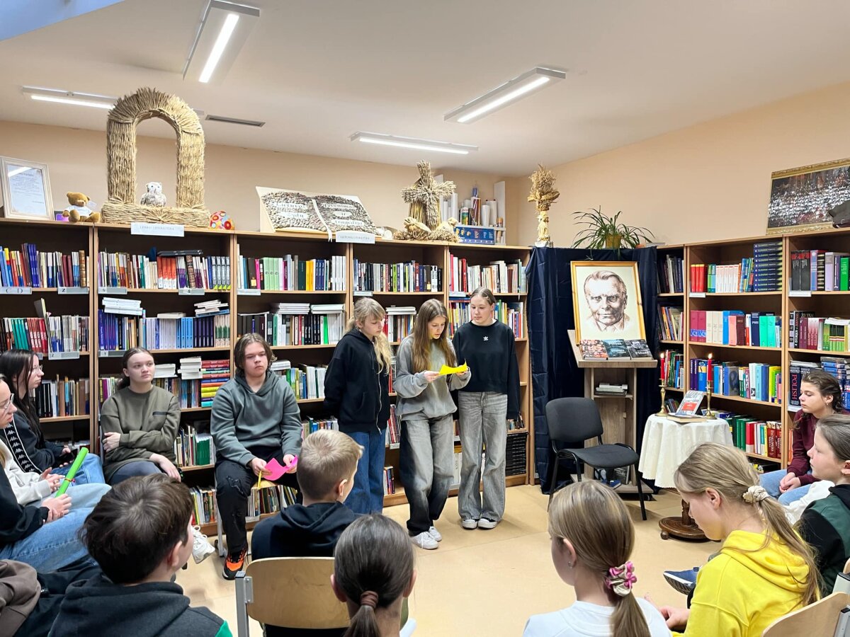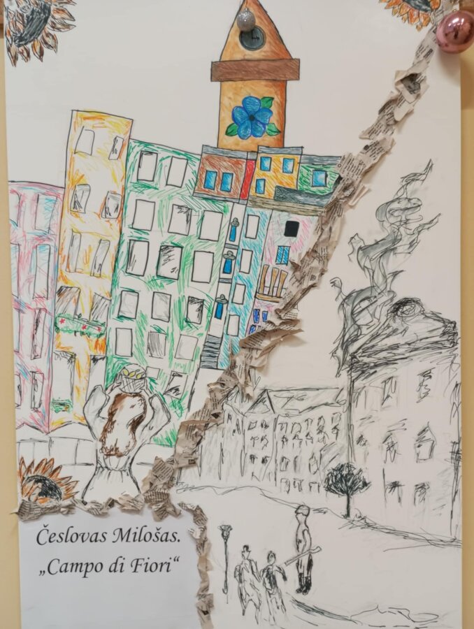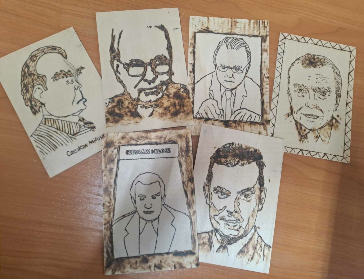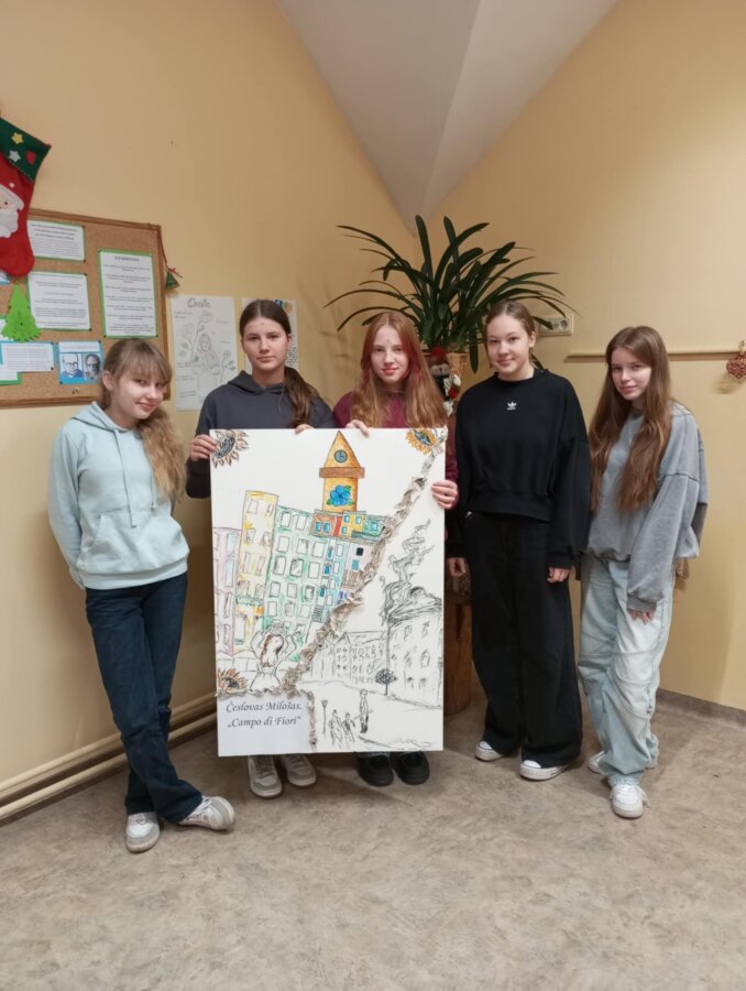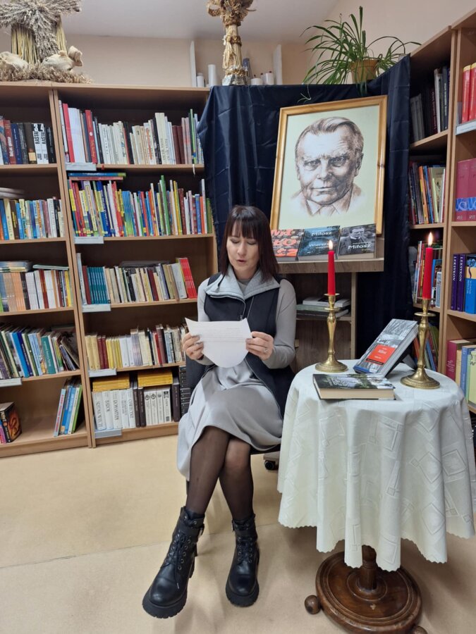 Poznawać Patrona szkoły dzieci rozpoczynają od najmłodszych. Przedszkolaki zapoznały się z Patronem szkoły poprzez układanie puzzli z wizerunkiem Cz. Miłosza. Uczniowie klas 1-10 wzięli udział w corocznym Biegu im. Cz. Miłosza, który łączył aktywność fizyczną z uczczeniem pamięci Patrona szkoły. Na lekcjach technologii ósmoklasiści wykonali portrety Miłosza techniką pirografii, czyli wypalania na drewnie, co pozwoliło im twórczo zinterpretować postać poety. Na lekcjach plastyki uczniowie klas 8 i 10, inspirowani zdjęciem Patrona szkoły, tworzyli kolaże techniką przeplatanki. Powstały trójwymiarowe portrety poety, które zyskały wyjątkowy, artystyczny wyraz. Na lekcjach języka litewskiego uczniowie klas 6, 8 i 9 stworzyli ilustracje oraz plakat do wierszy Cz. Miłosza. Zajęcia języka polskiego stały się okazją do zgłębienia biografii pisarza oraz historycznego kontekstu, w którym tworzył. Szóstoklasiści, czytając legendy wileńskie, tworzyli plakaty inspirowane miłością poety do przyrody i jego rodzinnych stron. Cz. Miłosz, urodzony nad Niewiażą, nazywał dolinę tej rzeki sercem Litwy i najpiękniejszym miejscem na ziemi. Przyroda litewska była mu szczególnie bliska, dlatego uczniowie w swoich pracach umieszczali elementy takie jak rzeka, wąż czy cytaty z jego twórczości, podkreślając piękno tych krajobrazów i więź poety z miejscem jego urodzenia. Uczniowie klasy 10 zapoznali się z grupą literacką „Żagary”, działającą w okresie dwudziestolecia międzywojennego, do której należał Cz. Miłosz. Poznali idee i cechy tej grupy, przeczytali kilka wierszy noblisty, a następnie obejrzeli film na podstawie książki Miłosza „Dolina Issy”. W bibliotece odbyła się lekcja „Czesław Miłosz na nowo odkryty” dla uczniów klas 5-10. Uczniowie i nauczyciele mieli okazję przeczytać wylosowane wiersze poety zarówno po polsku, jak i po litewsku. Dzięki tej inicjatywie młodzież mogła poznać różnorodne interpretacje poezji Miłosza w obu językach. Uczniowie przedstawili zespołowe interpretacje wybranych utworów, uświadamiając sobie, że poezja Miłosza, pełna uniwersalnych wartości, wciąż jest aktualna.