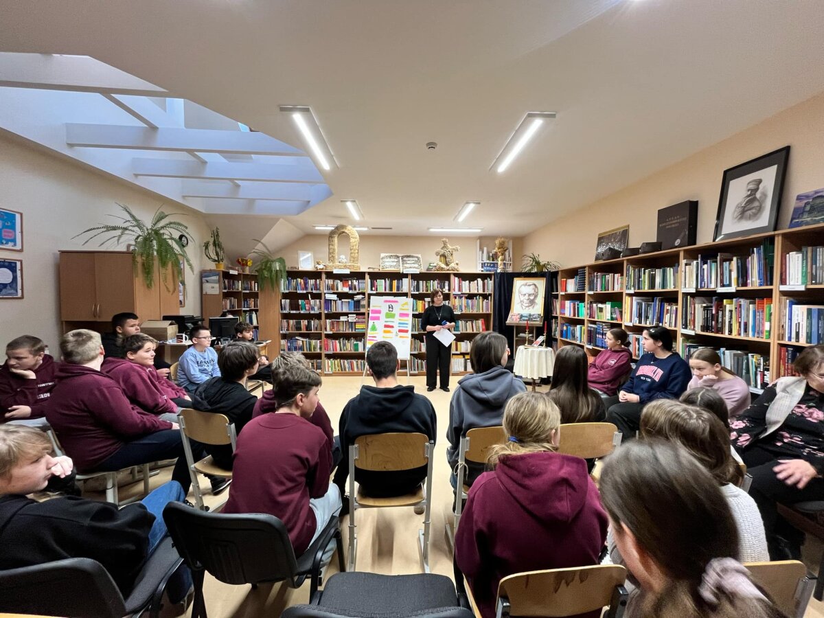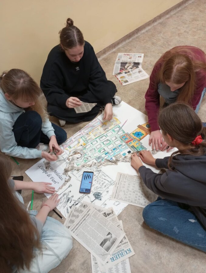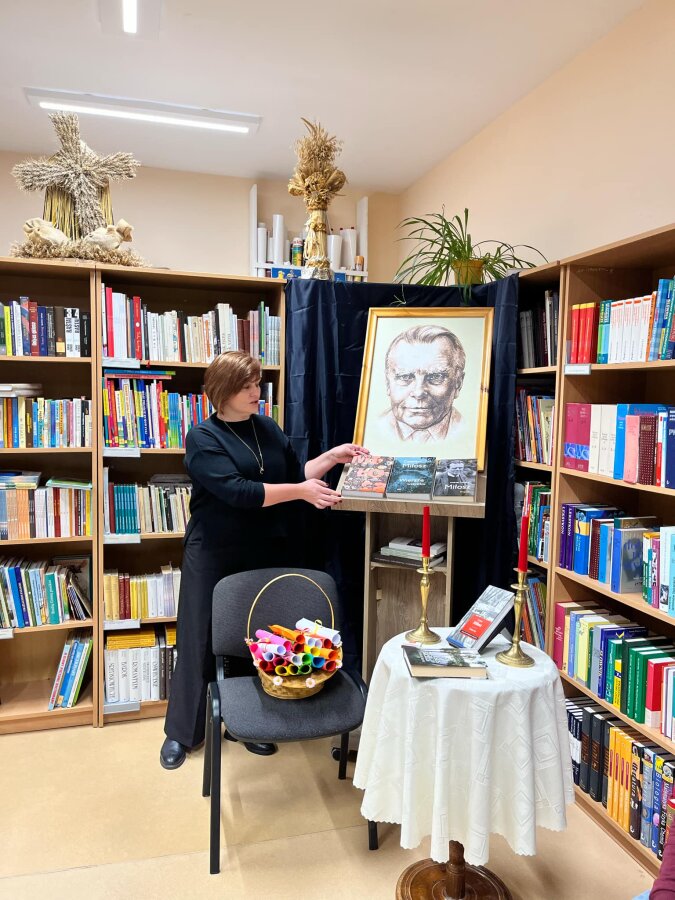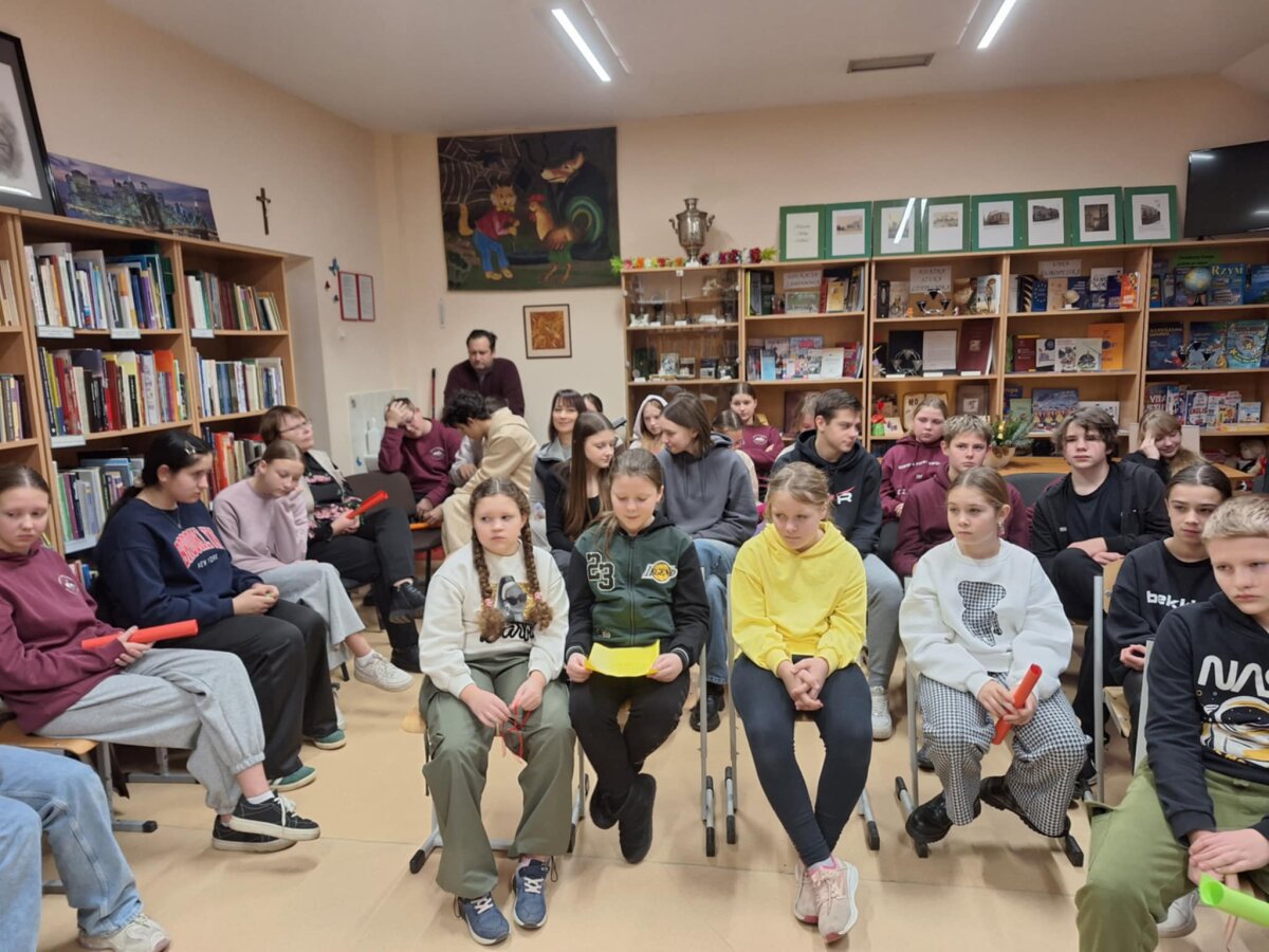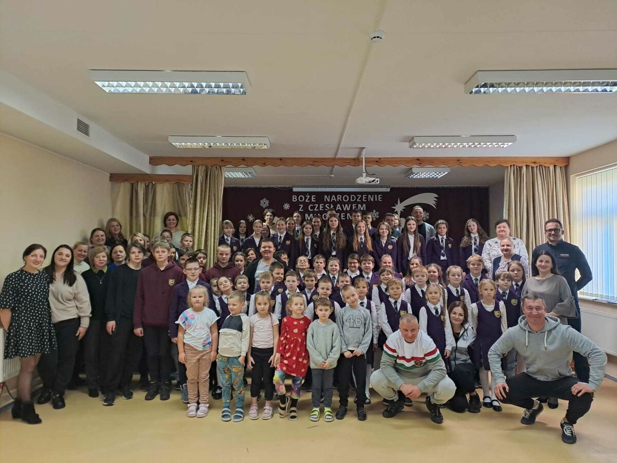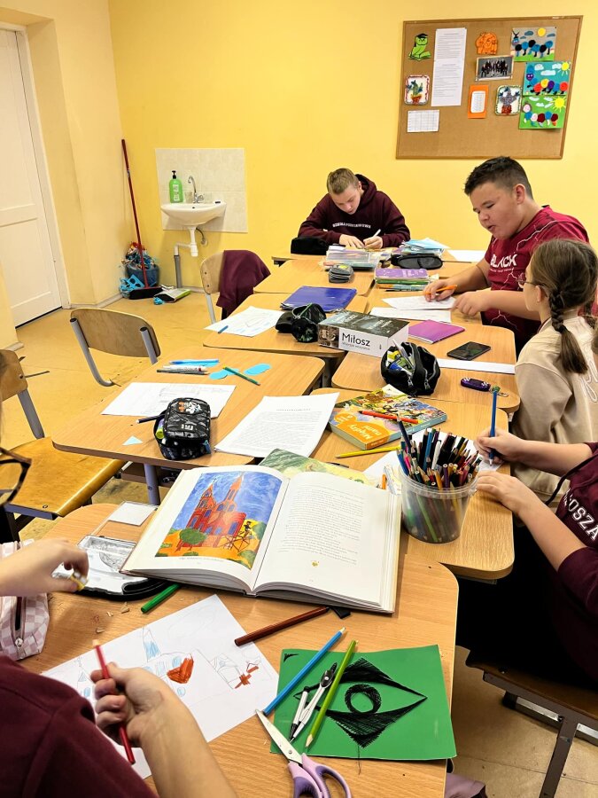 Poznawać Patrona szkoły dzieci rozpoczynają od najmłodszych. Przedszkolaki zapoznały się z Patronem szkoły poprzez układanie puzzli z wizerunkiem Cz. Miłosza. Uczniowie klas 1-10 wzięli udział w corocznym Biegu im. Cz. Miłosza, który łączył aktywność fizyczną z uczczeniem pamięci Patrona szkoły. Na lekcjach technologii ósmoklasiści wykonali portrety Miłosza techniką pirografii, czyli wypalania na drewnie, co pozwoliło im twórczo zinterpretować postać poety. Na lekcjach plastyki uczniowie klas 8 i 10, inspirowani zdjęciem Patrona szkoły, tworzyli kolaże techniką przeplatanki. Powstały trójwymiarowe portrety poety, które zyskały wyjątkowy, artystyczny wyraz. Na lekcjach języka litewskiego uczniowie klas 6, 8 i 9 stworzyli ilustracje oraz plakat do wierszy Cz. Miłosza. Zajęcia języka polskiego stały się okazją do zgłębienia biografii pisarza oraz historycznego kontekstu, w którym tworzył. Szóstoklasiści, czytając legendy wileńskie, tworzyli plakaty inspirowane miłością poety do przyrody i jego rodzinnych stron. Cz. Miłosz, urodzony nad Niewiażą, nazywał dolinę tej rzeki sercem Litwy i najpiękniejszym miejscem na ziemi. Przyroda litewska była mu szczególnie bliska, dlatego uczniowie w swoich pracach umieszczali elementy takie jak rzeka, wąż czy cytaty z jego twórczości, podkreślając piękno tych krajobrazów i więź poety z miejscem jego urodzenia. Uczniowie klasy 10 zapoznali się z grupą literacką „Żagary”, działającą w okresie dwudziestolecia międzywojennego, do której należał Cz. Miłosz. Poznali idee i cechy tej grupy, przeczytali kilka wierszy noblisty, a następnie obejrzeli film na podstawie książki Miłosza „Dolina Issy”. W bibliotece odbyła się lekcja „Czesław Miłosz na nowo odkryty” dla uczniów klas 5-10. Uczniowie i nauczyciele mieli okazję przeczytać wylosowane wiersze poety zarówno po polsku, jak i po litewsku. Dzięki tej inicjatywie młodzież mogła poznać różnorodne interpretacje poezji Miłosza w obu językach. Uczniowie przedstawili zespołowe interpretacje wybranych utworów, uświadamiając sobie, że poezja Miłosza, pełna uniwersalnych wartości, wciąż jest aktualna.