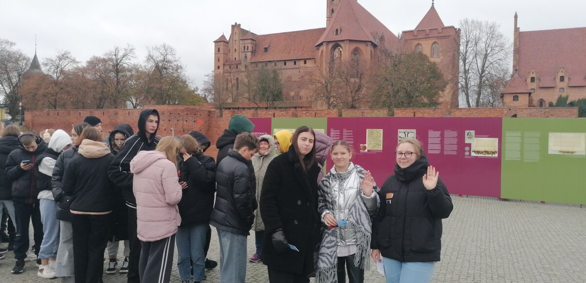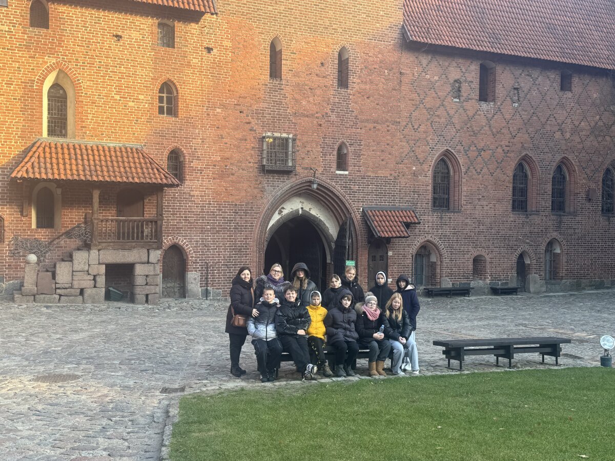 Piątego dnia projektu uczniowie mieli okazję zwiedzić jeden z najwspanialszych zabytków Polski, wpisany na listę światowego dziedzictwa UNESCO potężny Zamek w Malborku. To imponujące miejsce, będące jednocześnie największym średniowiecznym zamkiem w Europie, pozwoliło uczniom przenieść się w czasie do epoki Krzyżaków. Podczas zwiedzania uczniowie odkrywali fascynującą historię tego miejsca, zwracając szczególną uwagę na jego architekturę, unikalne detale i historię obiektów wojskowych oraz religijnych. Projekt nie tylko dostarczył wiedzy z muzyki, fizyki, historii, techniki, ale także zapewnił niezapomniane przeżycia, wrażenia i wspomnienia.