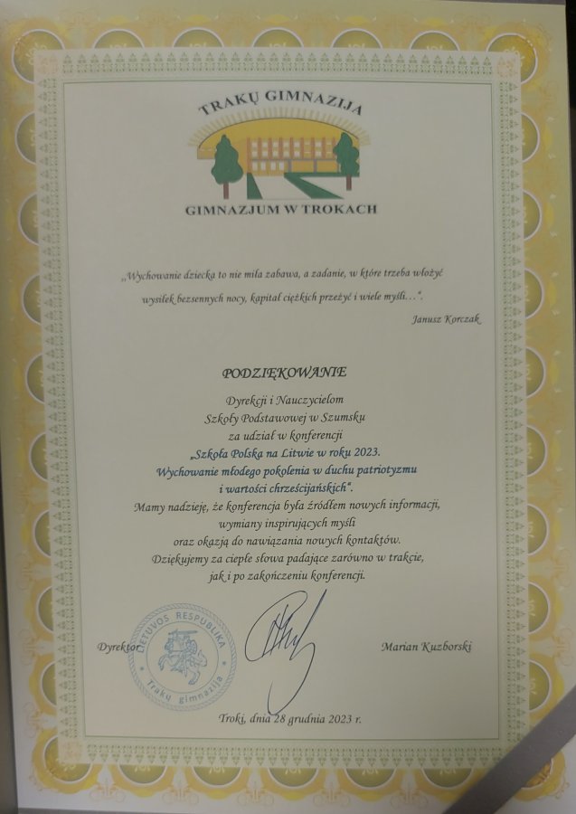 Dyrektor szkoły Inesa Korwiel oraz starczy nauczyciel języka polskiego Czesława Błażewicz wzięły czynny udział w konferencji pod hasłem: „Wychowanie młodego pokolenia w duchu patriotyzmu i wartości chrześcijańskich” w Gimnazjum w Trokach, gdzie wygłosiły przemówienie „Wychowanie obywatelskie i patriotyczne w Szkole Podstawowej w Szumsku; działalność społeczna i obywatelska uczniów”.