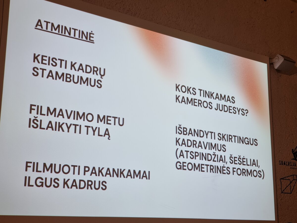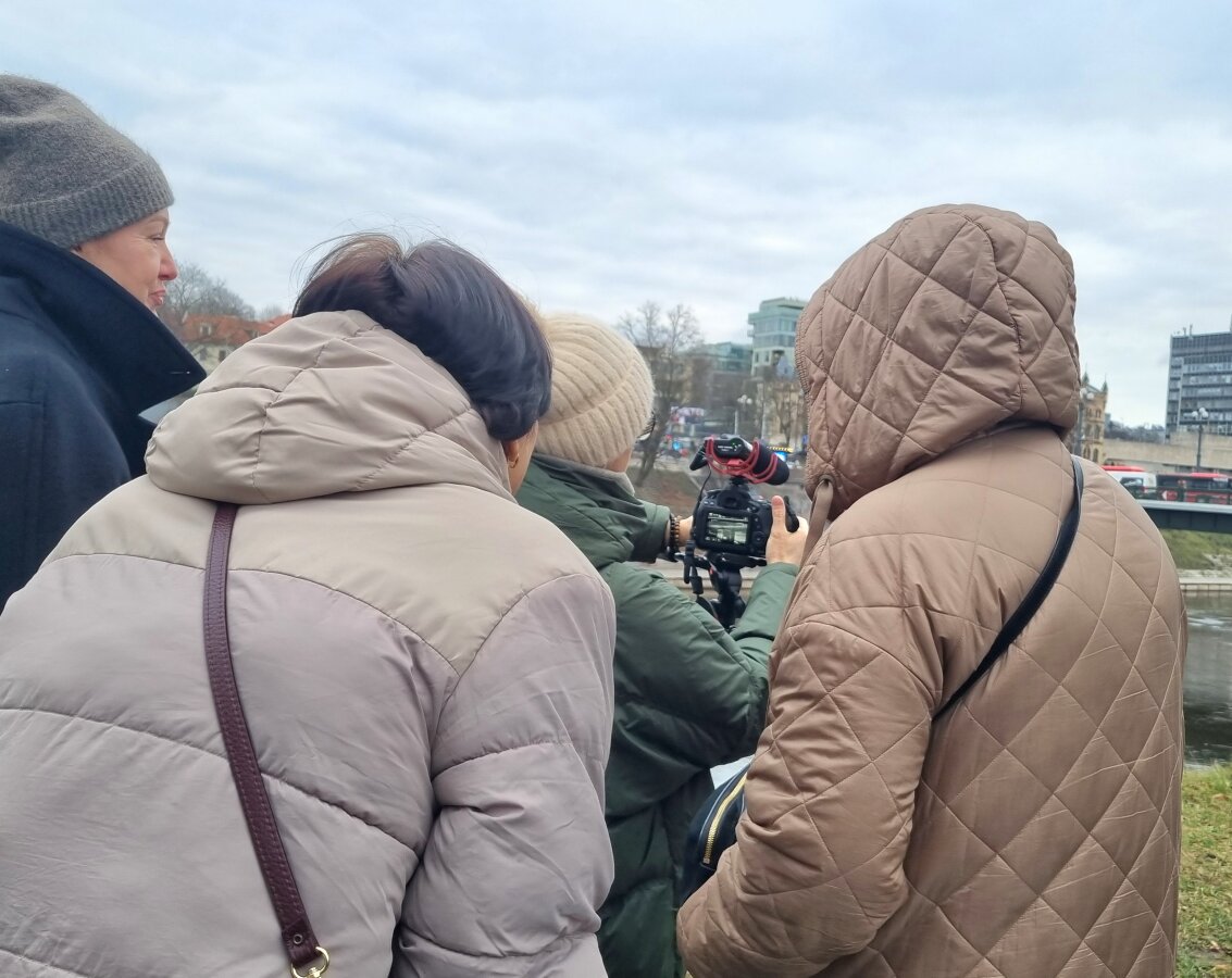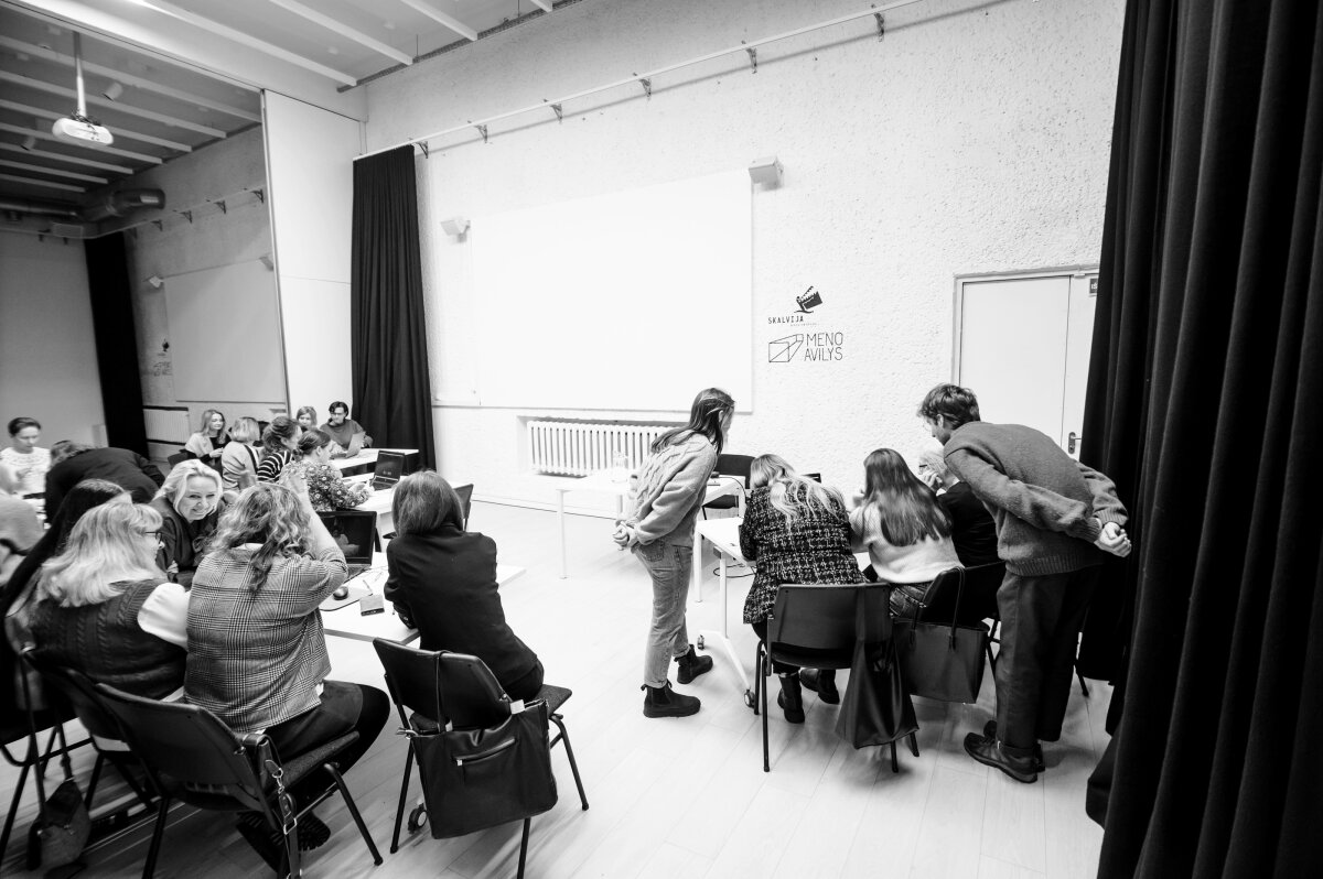 Pierwsza, wprowadzająca część projektu „Duże Małe Ekrany” dla nauczycieli miała miejsce w sinematece „Meno Avilys” w Wilnie. Podczas spotkania nauczyciele dowiedzieli się o pochodzeniu dźwięku i obrazu oraz zapoznali się i przetestowali materiały metodyczne, które później były wykorzystane podczas prowadzenia zajęć w swoich placówkach oświatowych. Już po raz drugi edukatorzy spotkali się w tym samym miejscu, aby wziąć udział w warsztatach twórczych i szkoleniach praktycznych, które poprowadzili kierownik montażu Jonas Juškaitis i reżyserka oraz animatorka Emilija Juzeliūnaitė. Ten duet pracuje nad projektem od kilku lat, co zainspirowało uczestników warsztatów do dalszej pracy nad szkoleniem i projektem. Po przetestowaniu programu do edycji wideo na komputerze nauczyciele pracowali w grupach i po intensywnej pracy z kamerą wideo w centrum Wilna stworzyli krótkie filmy na zadany temat. Naprawdę ciekawe było rozważać, który z pięciu możliwych tematów był podstawą prac kolegów.