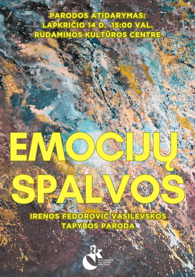 Rudaminos kultūros centras kviečia į Irenos Fedorovič Vasilevskos tapybos parodos „Emocijų spalvos“ atidarymą!Pasinerkite į spalvų ir jausmų pasaulį, kuriame kiekvienas potėpis pasakoja savitą istoriją!