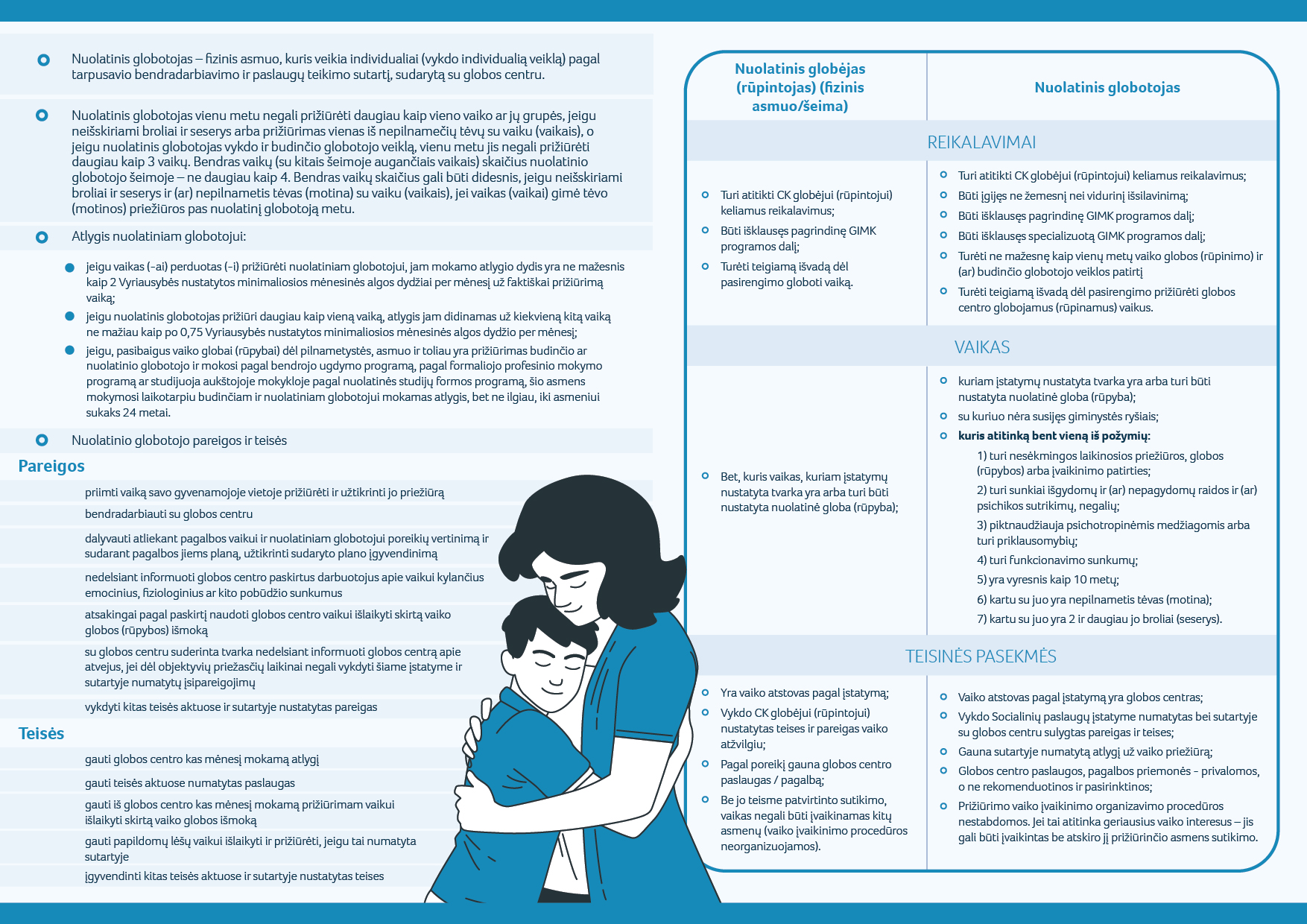 Kas yra nuolatinis globotojas? Tai fizinis asmuo, pagal tarpusavio bendradarbiavimo ir paslaugų teikimo sutartį, sudarytą su globos centru, prižiūrintis likusį be tėvų globos vaiką, kuriam įstatymų nustatyta tvarka yra arba turi būti nustatyta nuolatinė globa (rūpyba), su kuriuo nesusijęs giminystės ryšiais ir kuris atitinka bent vieną iš nurodytų požymių: