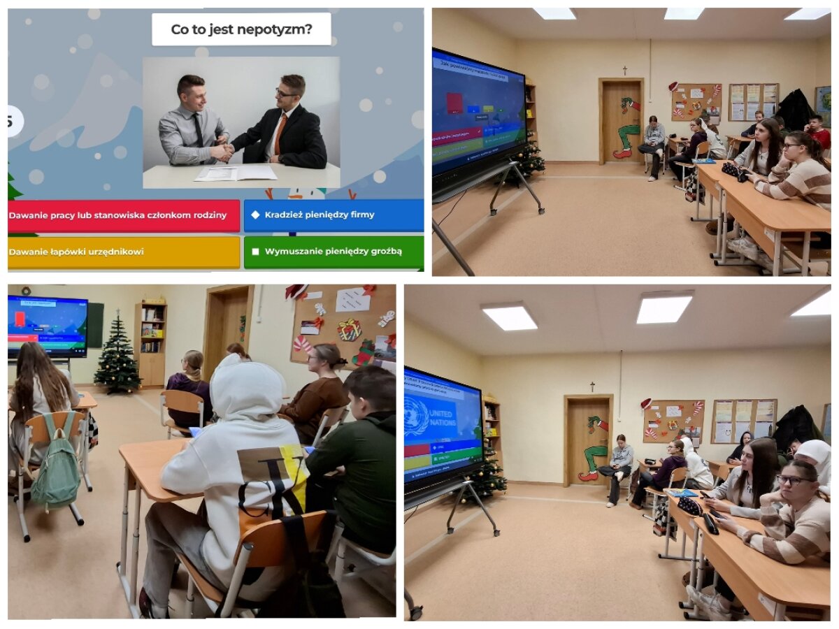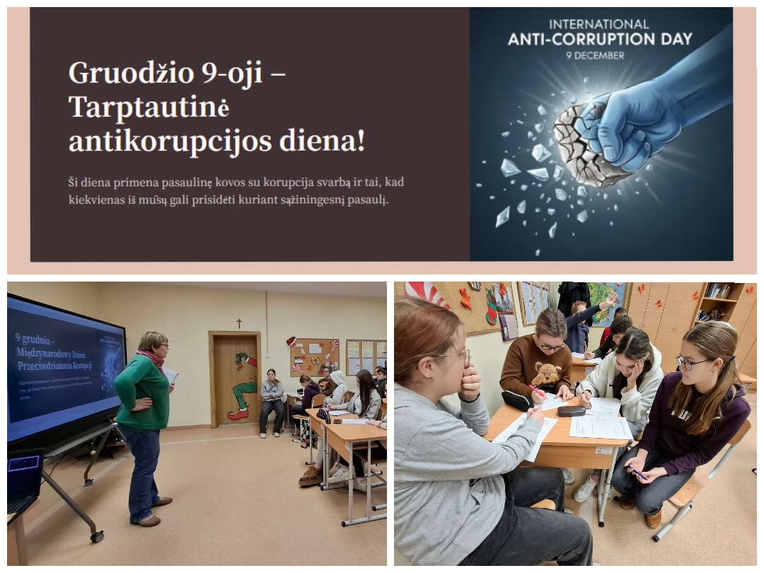 Gruodžio 9 d. minėjome Tarptautinę antikorupcijos dieną. Šia proga 9–10 klasių mokiniai dalyvavo integruotoje pilietiškumo pagrindų ir tikybos pamokoje, skirtoje sąžiningumo ir korupcijos temai.