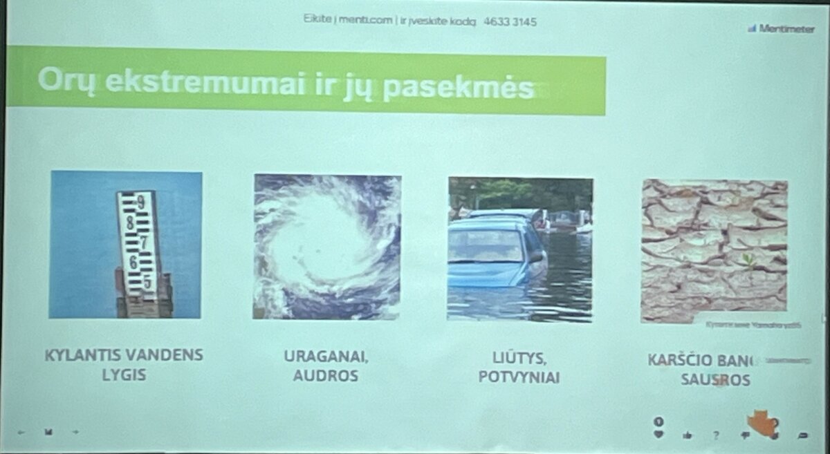 Daug kartų girdėti dalykai apie klimato atšilimą, šiltnamio efektą iš lektorės Ievos Budraitės lūpų nuskambėjo naujai pasitelkiant analogijų ir įtaigių pavyzdžių. Kaip žinia, vidutinė oro temperatūra yra pakilusi 1.2 laipsnio, galima manyti, kad tai nedaug, tačiau „Kaip jaustumėtės, jeigu jūsų kūno temperatūra būtų nebe 36.6, o 37.8?“, – klausė lektorė. Tai verčia susimąstyti apie tai, kad mūsų planeta „serga“. Dėl, rodos, menko temperatūros pokyčio kyla ekstremalių pasekmių: potvynių, gaisrų. Skeptikai gali sakyti, kad Žemės klimatas nuolat keitėsi, tačiau esminis skirtumas, kad dabar tuos pokyčius lemia žmogaus ūkinė veikla. Labiausiai aplinką veikia Kinijos ir JAV pramonė, tačiau ar tik tos šalys yra kaltos dėl neigiamų pasekmių? Esminis klausimas – kaip kiekvienas galėtų prisidėti prie teigiamų planetos pokyčių. Paprasti sprendimai: pakeisti savo keliavimo įpročius, rinktis daugiau augalinės kilmės produktų vietoj mėsos, taisyti turimus ir pirkti panaudotus daiktus – gali būti lemtingi.