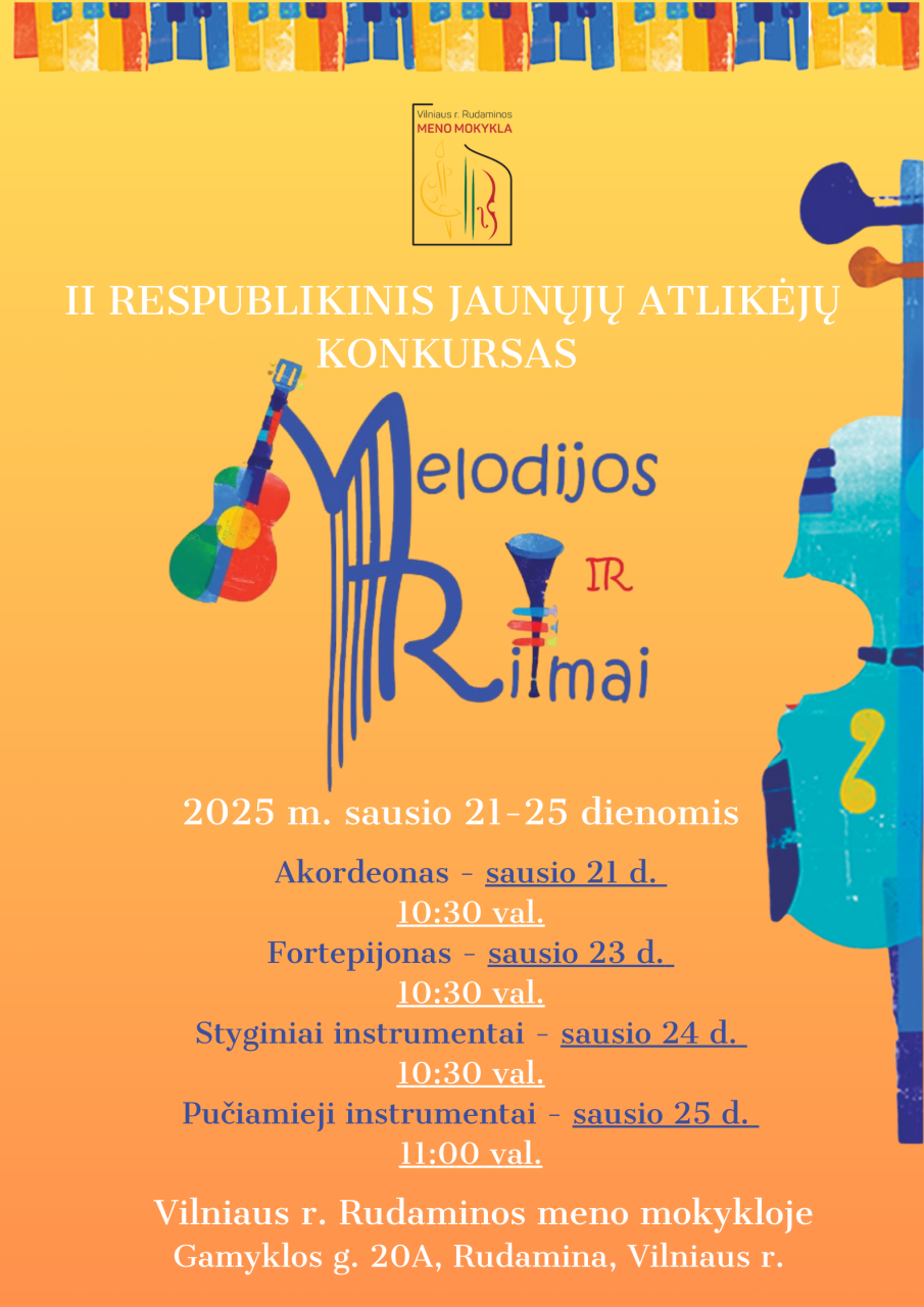 Rudaminos meno mokykla sausio 21-25 dienomis kviečia į II respublikinį jaunųjų atlikėjų instrumentinės muzikos konkursą „Melodijos ir ritmai“ 2025.
