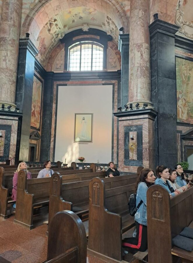 Pirmasis išvykos taškas – įspūdingasis Pažaislio vienuolynas, vienas iš gražiausių baroko architektūros pavyzdžių Lietuvoje. Šis kamaldulių vienuolynas, pastatytas XVII a., paliko neišdildomą įspūdį savo harmoninga architektūra, tylos atmosfera ir subtiliu ryšiu su gamta. Ekskursijos metu mokytoja Romualda trumpai papasakojo ne tik apie pastatų istoriją, bet ir apie vienuolių gyvenimo būdą, jų kasdienę rutiną bei dvasinius ieškojimus. Daugiau informacijos išvykos dalyviai pasisėmė Pažaislio kamaldulių vienuolyno ansamblio pietų oficinoje, kurioje įrengta edukacinė klasė ir ekspozicijos erdvės.