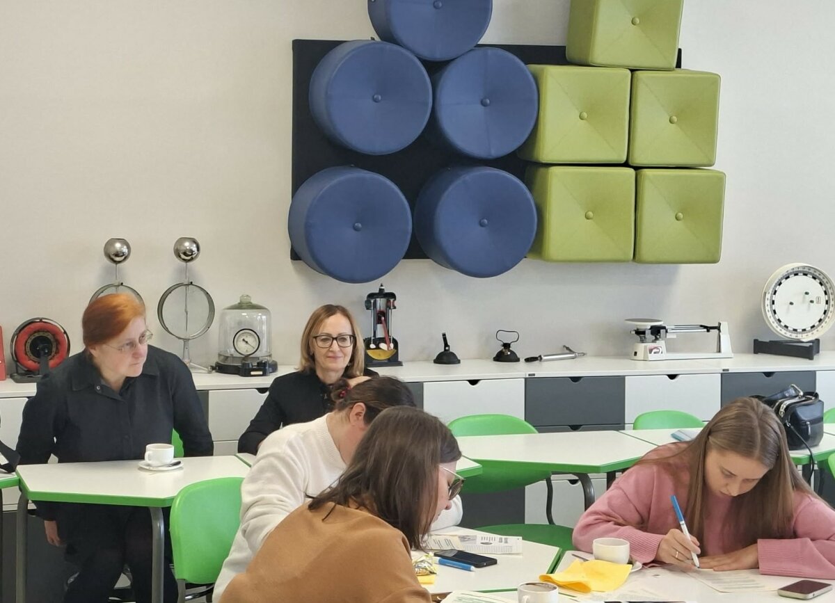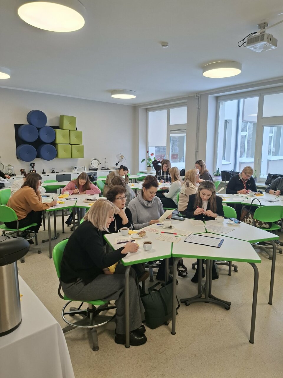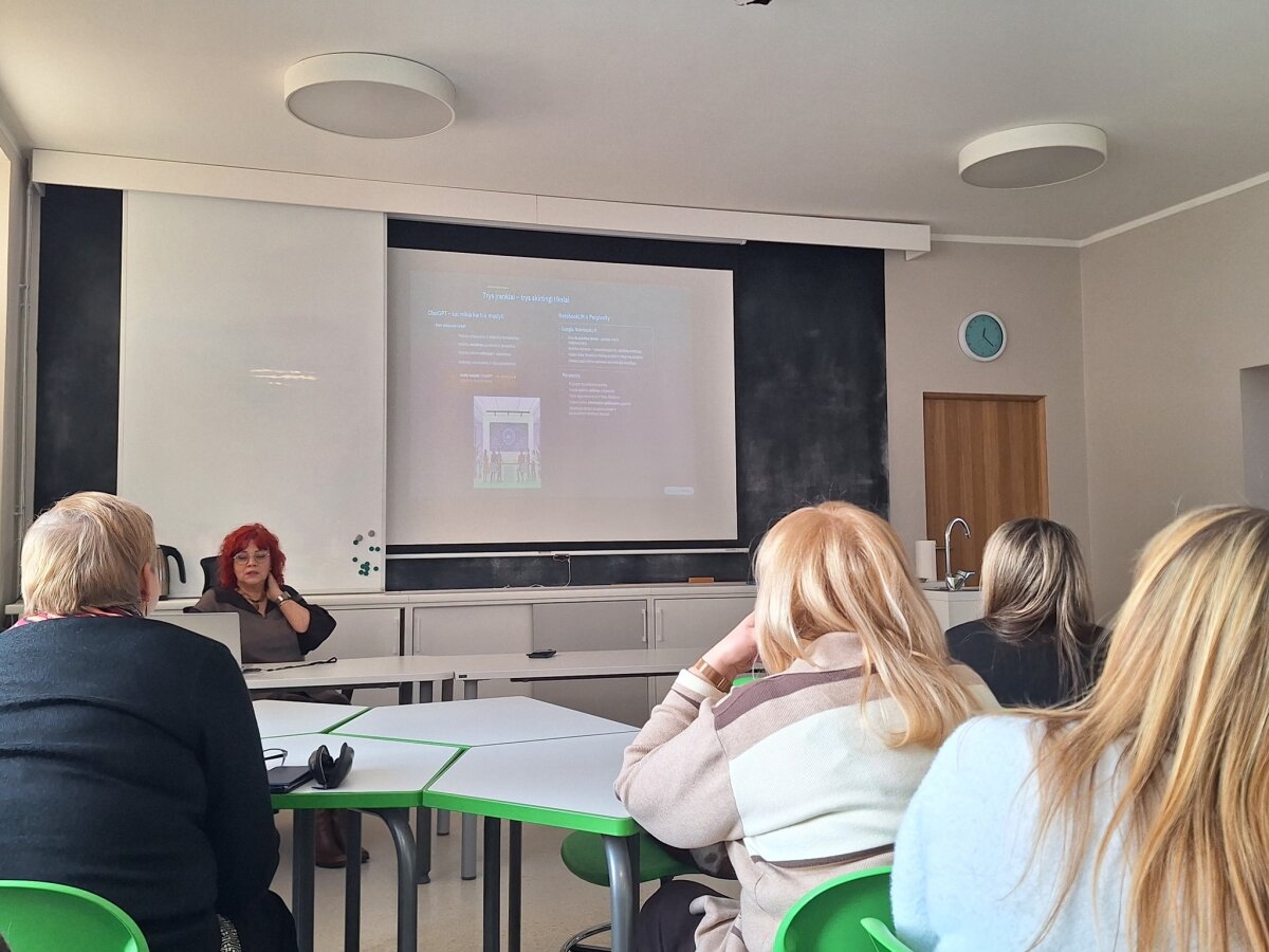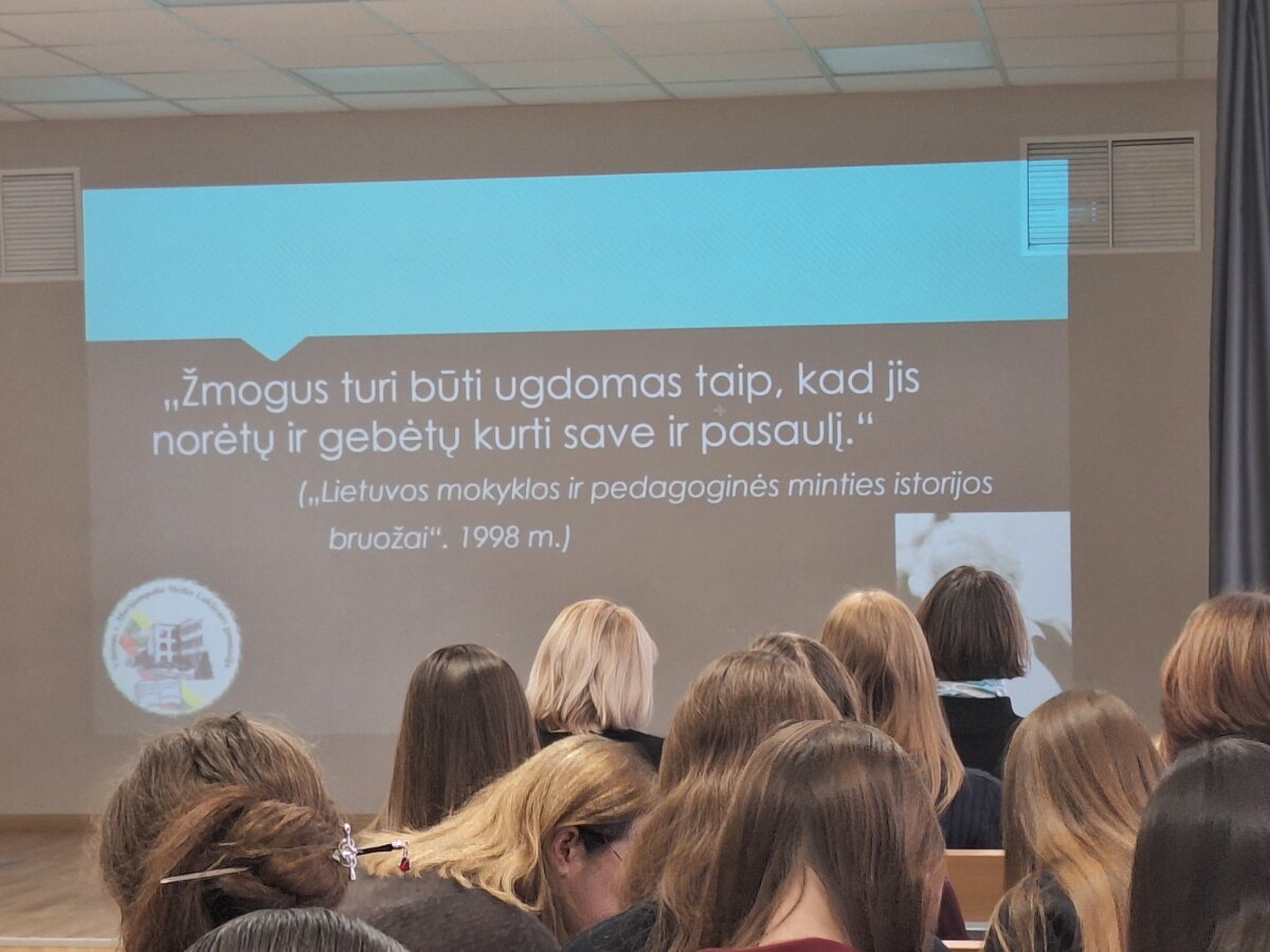 Tuo metu mokytojams vyko poeto Tomo Taškausko organizuotos „Išbraukiamosios poezijos dirbtuvės“. Vėliau mokytojai klausė direktorės Jūratės Adrijos Šidlauskienės pranešimo „DI mokytojo darbe“. Gimnazijos lietuvių kalbos ir literatūros mokytojos Rita Sakalauskienė bei Daiva Stakišaitienė, kartu su matematikos ir informatikos mokytoja Regina Garpuškinienė, pasidalijo gerąja patirtimi ir skaitė pranešimą „Lietuvių kalbos integravimas“.