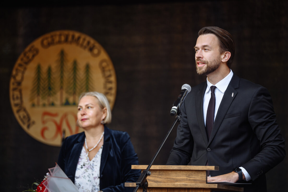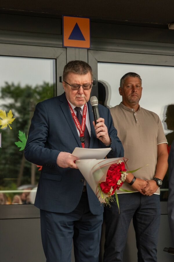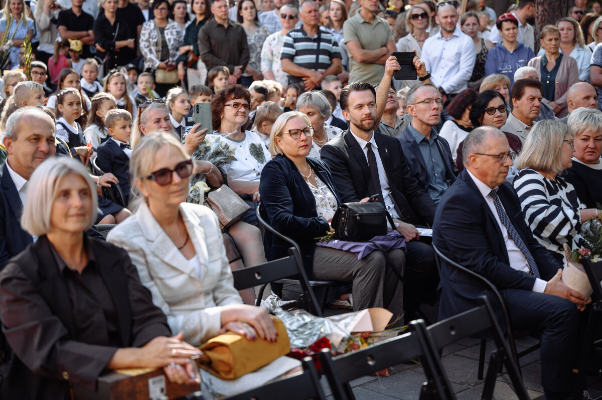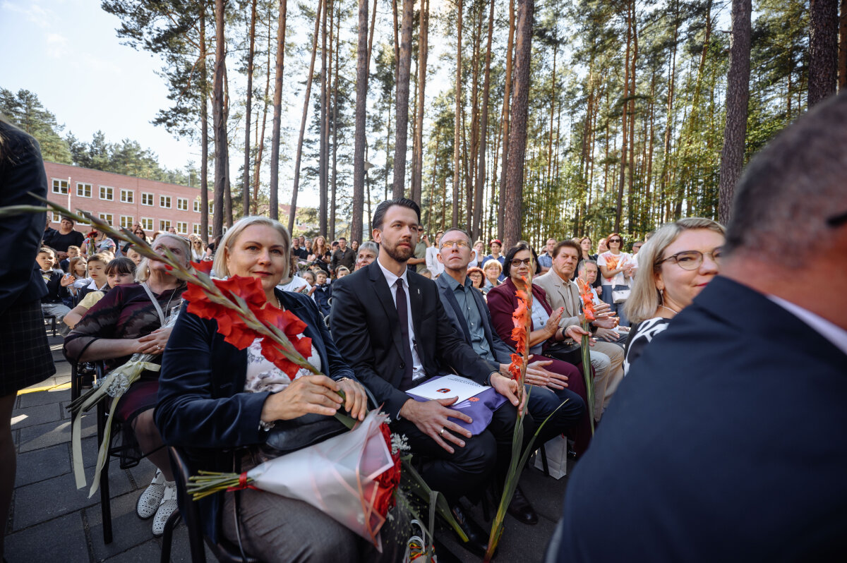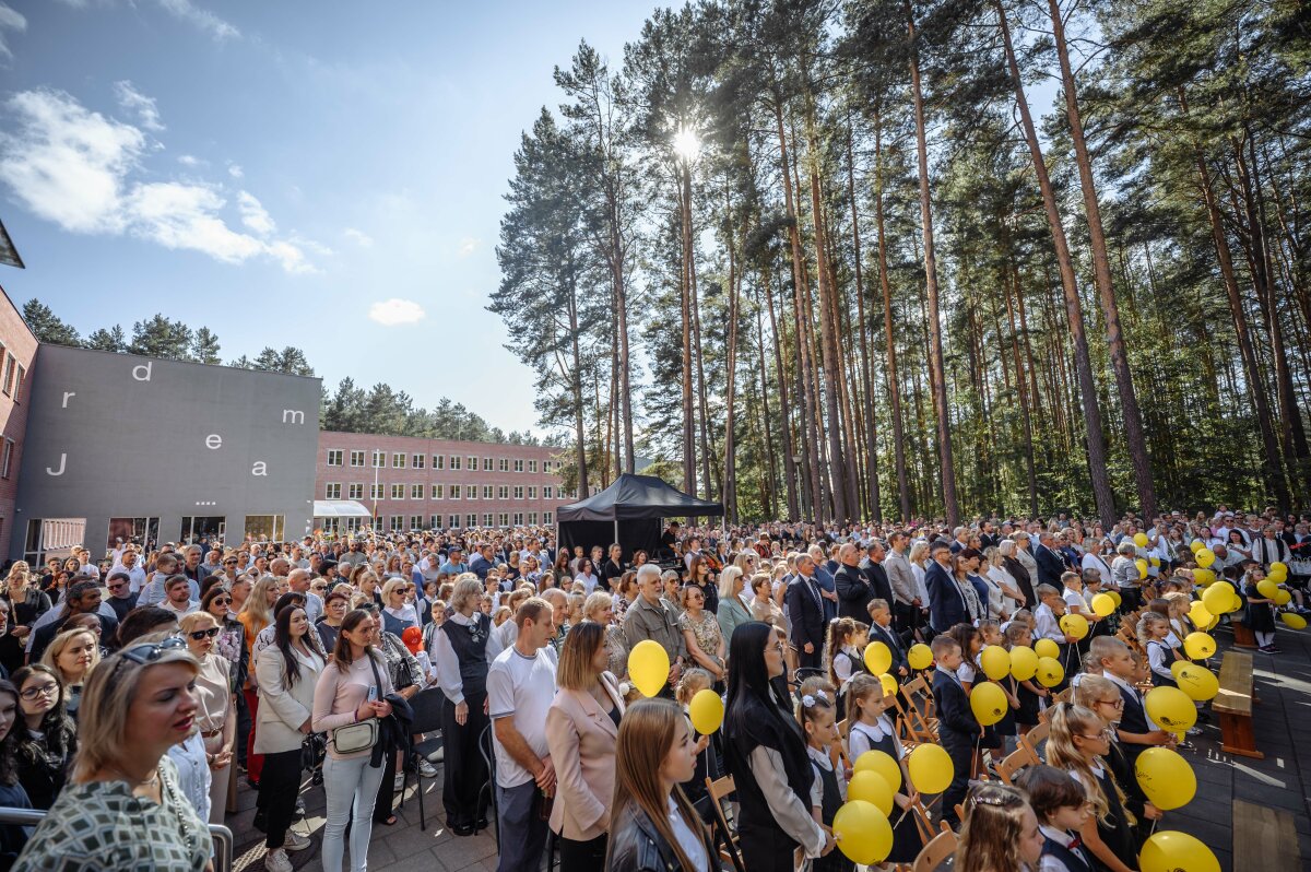 „Sveikinu visus Rugsėjo 1-osios proga. Tai, be abejo, ypatinga diena visiems čia esantiems: mokiniams, jų tėvams bei pedagogams. Šiandien ši šventė taip pat ypatinga tuo, kad šalia gimnazijos pradeda veikti naujasis modulinis darželis, kuris buvo pastatytas itin greitai, vos per dvi savaites, nepaisant to, kad projektui įgyvendinti prireikė dvejų metų“, – sakė vicemeras A. Vaitkevičius.