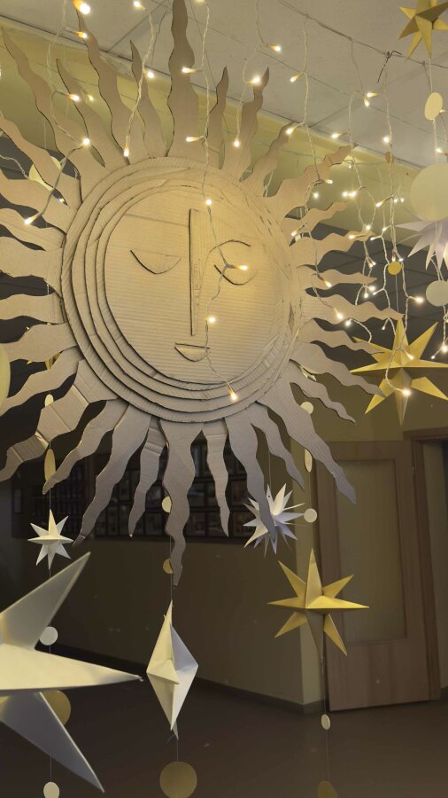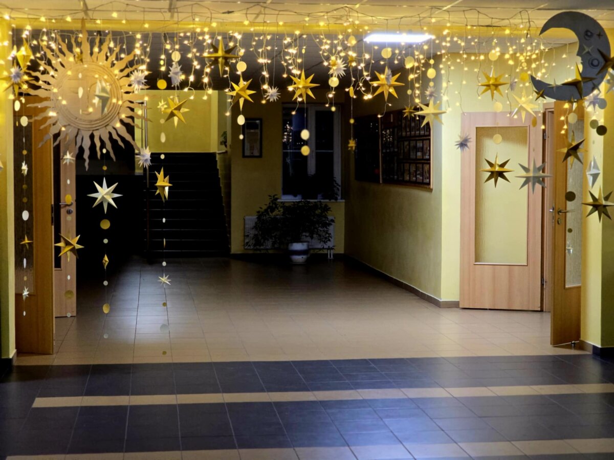 Gimnazijos fojė išryškėjo kaip subtilus dienos akcentas. III ir IV gimnazijos klasių dailės kurso mokiniai, vadovaujami dailės mokytojos Dovilės Blažytės-Vanagienės, čia pakabino popierines žvaigždes ir lengvas formas, kurios pripildė erdvę ramybės ir šviesos nuotaikos. Jų ritmas ir lengvumas priminė M. K. Čiurlionio kūrybos šviesos virpėjimą.