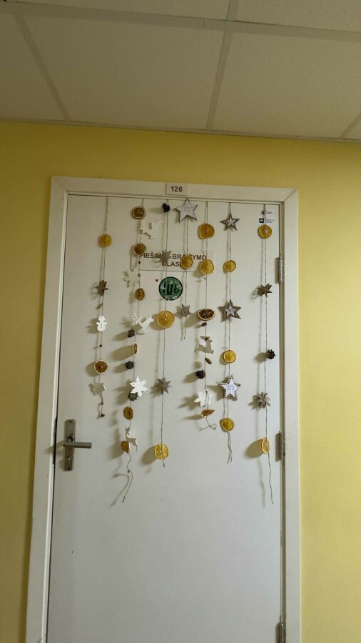 Prie mokyklos lauko įėjimo dirbo technologijų mokytoja Daiva Kurpienė kartu su IV gimnazijos klasės mokiniais. Jų sukurta erdvė tapo jaukiu kvietimu įžengti į žiemos šviesa alsuojančią gimnaziją.