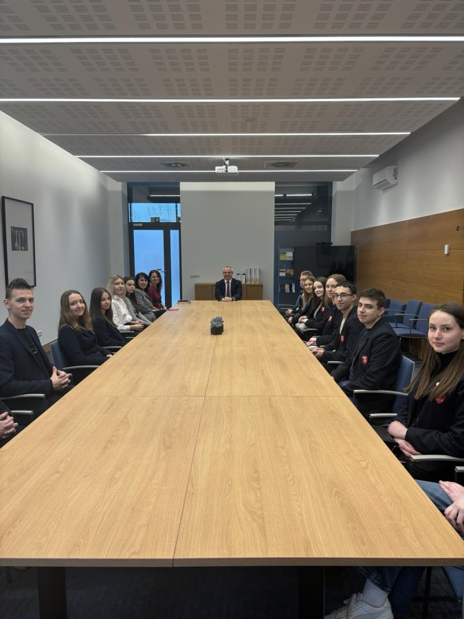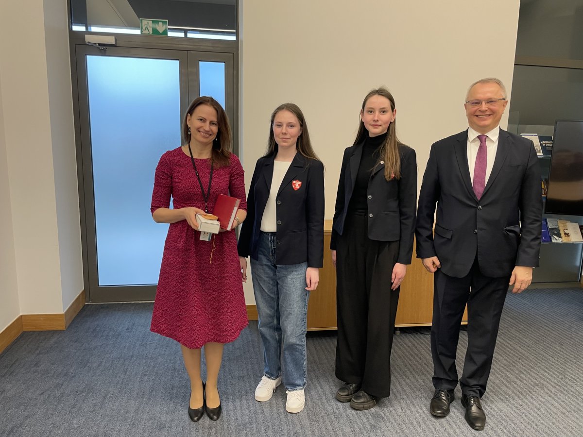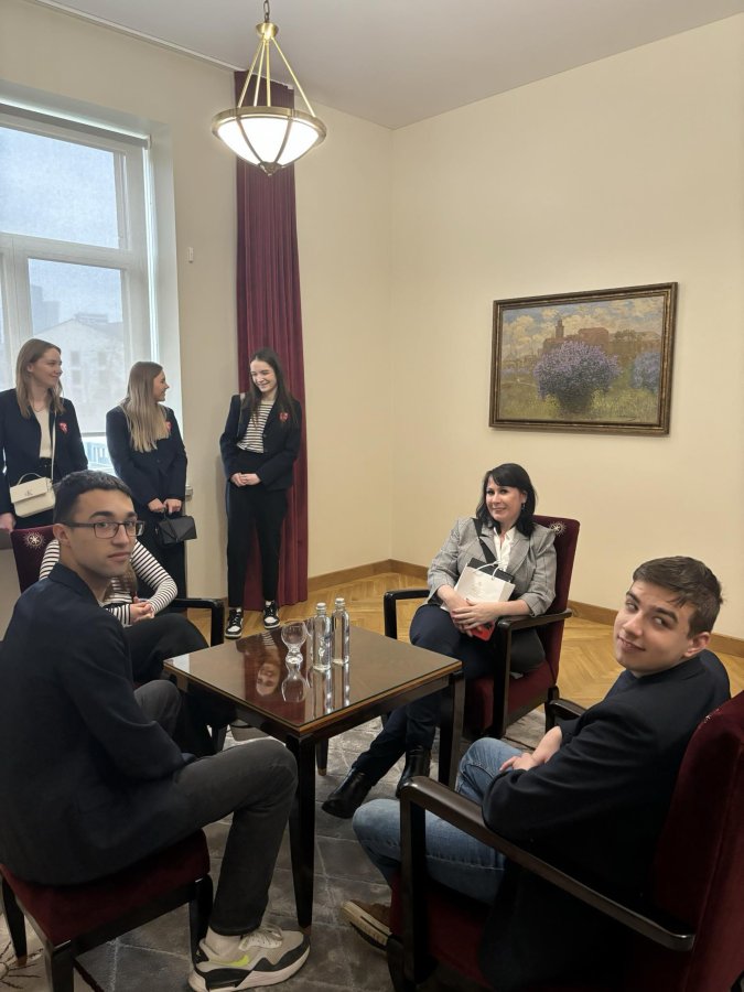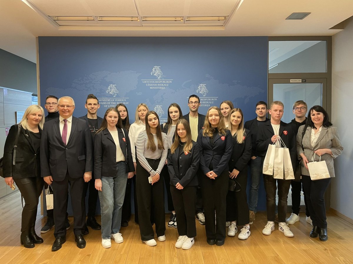Susitikimą inicijavo gimnazijos direktorius O. Nikončik, o mus atlydėjo MEPA projekto vyresniosios ambasadorės L. Jeremejeva ir R. Jachimovičienė (mokykla dalyvauja projekte „Mokyklos – Europos Parlamento ambasadorės). Pirmiausia mes susitikome su viceministru Egidijumi Meilūnu, kuris papasakojo apie diplomatinę tarnybą (kas tai yra, kodėl ji reikalinga, kaip ji veikia ir pan.). E. Meilūnas apžvelgė geopolitinę padėtį, augančius ekonominius ryšius ir intensyvų bendradarbiavimą saugumo ir gynybos srityse su kitomis valstybėmis. Taip pat mums buvo paaiškinta apie Europos Sąjungos, NATO reikšmę Lietuvai, kodėl reikalingas stiprus transatlantinis ryšys. Be to, viceministras su mumis diskutavo apie ateities planus, kalbėjo apie perspektyvas mūsų šalyje, sumaniosios specializacijos prioritetus, pateikė sėkmės receptą: parekomendavo rinktis biologijos, fizikos ir IT sritis, nes, anot viceministro, mūsų šalyje garantuota šviesi ateitis būtent tose srityse.