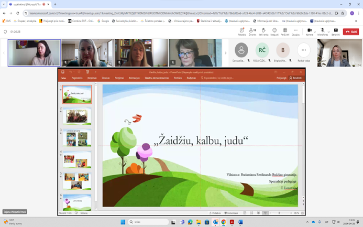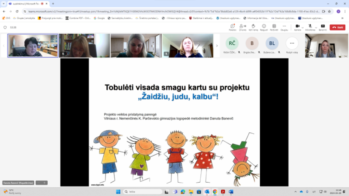 Balandžio 26 d. Vilniaus rajono savivaldybės švietimo įstaigų specialiųjų pedagogų ir logopedų metodinis būrelis bendradarbiaudamas su Švietimo skyriumi organizavo nuotolinę, respublikinio bendrojo ugdymo mokyklų, vykdančių pradinio ugdymo programas, projekto „Žaidžiu, kalbu, judu“ rezultatų aptarimui skirtą vaizdo konferenciją.
