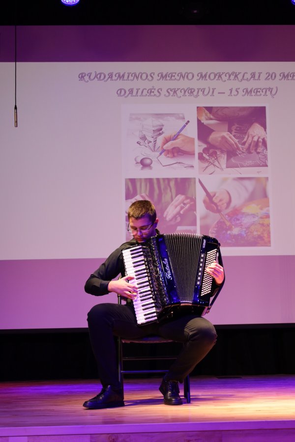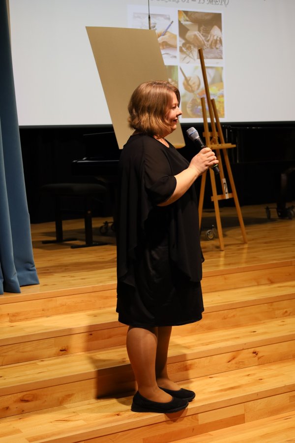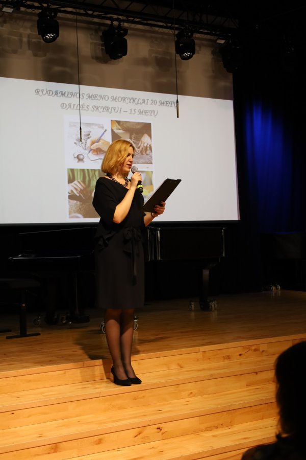 Dailės metodinės grupės pirmininkė Ivona Dakinevič iškilmingai pristatė dailės skyriaus kelią per pastaruosius 15 metų, pradedant nuo mokyklos įkūrimo iki dabartinių dienų, o savp kalbą lydėjo nuotaikingomis nuotraukomis. Dailės mokytoja metodininkė Ivona Dakinevič paminėjo, kad Rudaminos meno mokyklos mokiniai sėkmingai dalyvavo 43-uose tarptautiniuose, respublikiniuose, Vilniaus regiono ir mokykliniuose konkursuose. Apie 200 mokinių tapo šių konkursų dalyviais, nominantais, laureatais ir net du užėmė Grand Prix vietas. „Labai džiugu“, – sakė ji – „kad kasmet, nuo 2019 m., mūsų jaunieji dailininkai būna apdovanojami Vilniaus rajono mero „Geriausias metų mokinys“ nominacijoje. Taip pat apdovanojami ir mokinius paruošę pedagogai“.