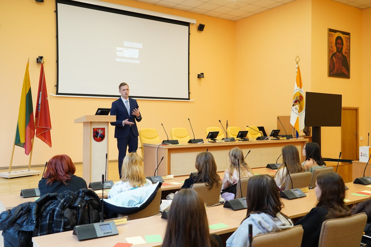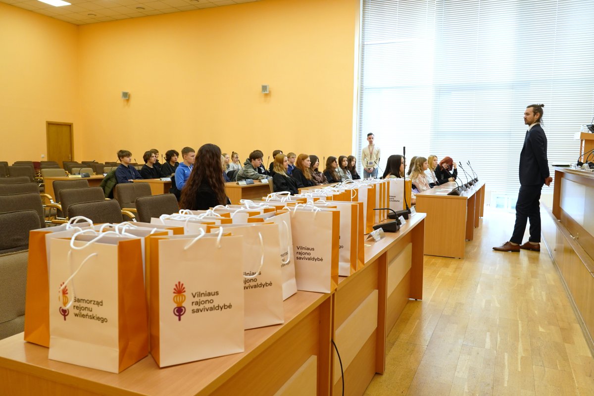 Vilniaus rajono savivaldybės tarybos narys, Socialdemokratų frakcijos seniūnas Ruslanas Baranovas supažindino mokinius su tarybos veikla, sprendimų priėmimo tvarka, komitetų veikla, mokiniams parengė Tarybos posėdžio simuliaciją, kuomet mokiniai pakeldami spalvotus lapelius į viršų galėjo balsuoti „už“ arba „prieš“ pristatomą sprendimą.