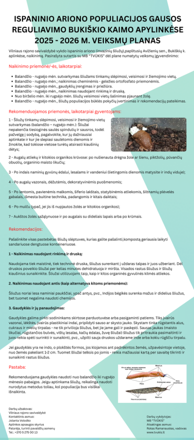 Siekiant efektyvesnio šliužų naikinimo, Vilniaus rajono savivaldybė organizuoja talkas šliužams rinkti su vietos gyventojais. Bendruomenių atstovus kviečiame imtis lyderystės ir skatinti gyventojus jungtis.